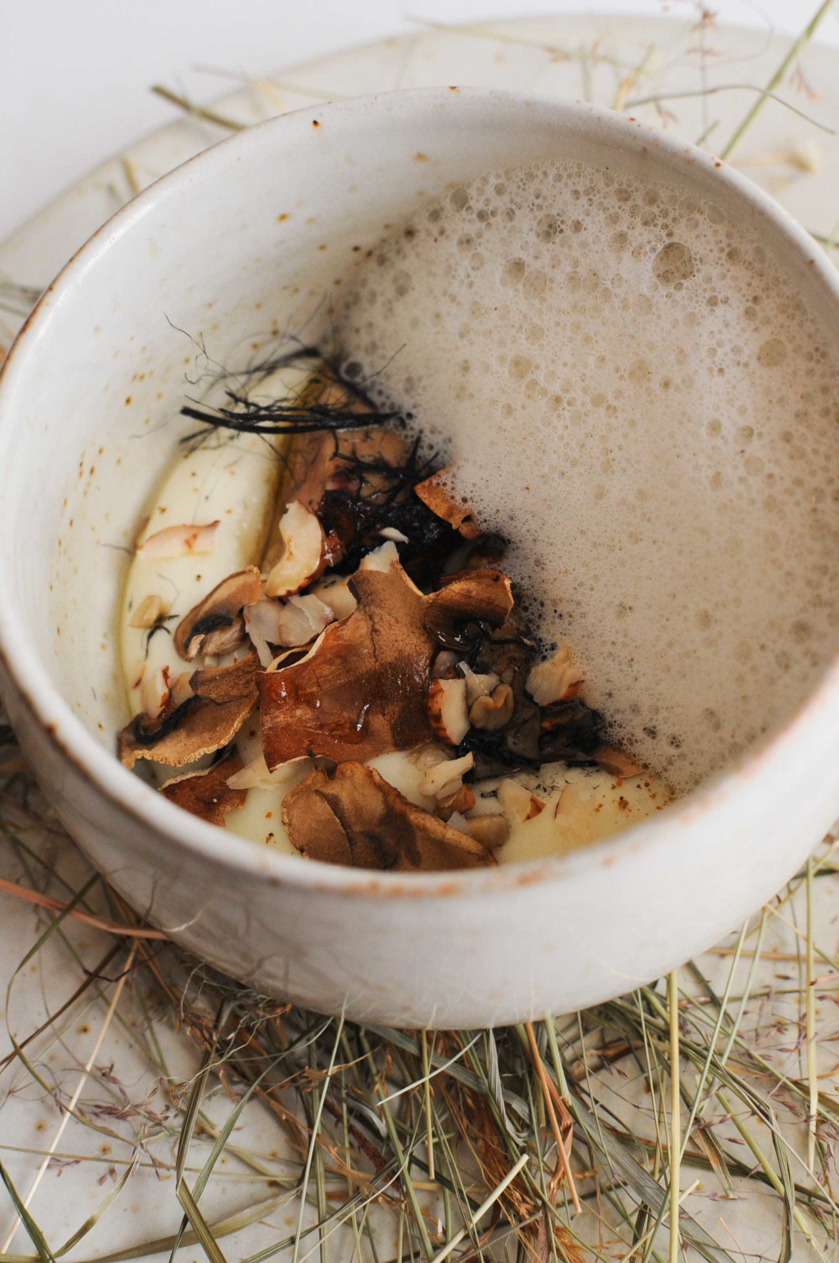 Magie de l’oeuf, Saint-Nectaire crémeux, crumble noisette, fines lamelles de courgette, feuille d’oseille, fleurs de bourrache, quelques graines et jus de berce versé au moment… un délice de textures et de saveurs.