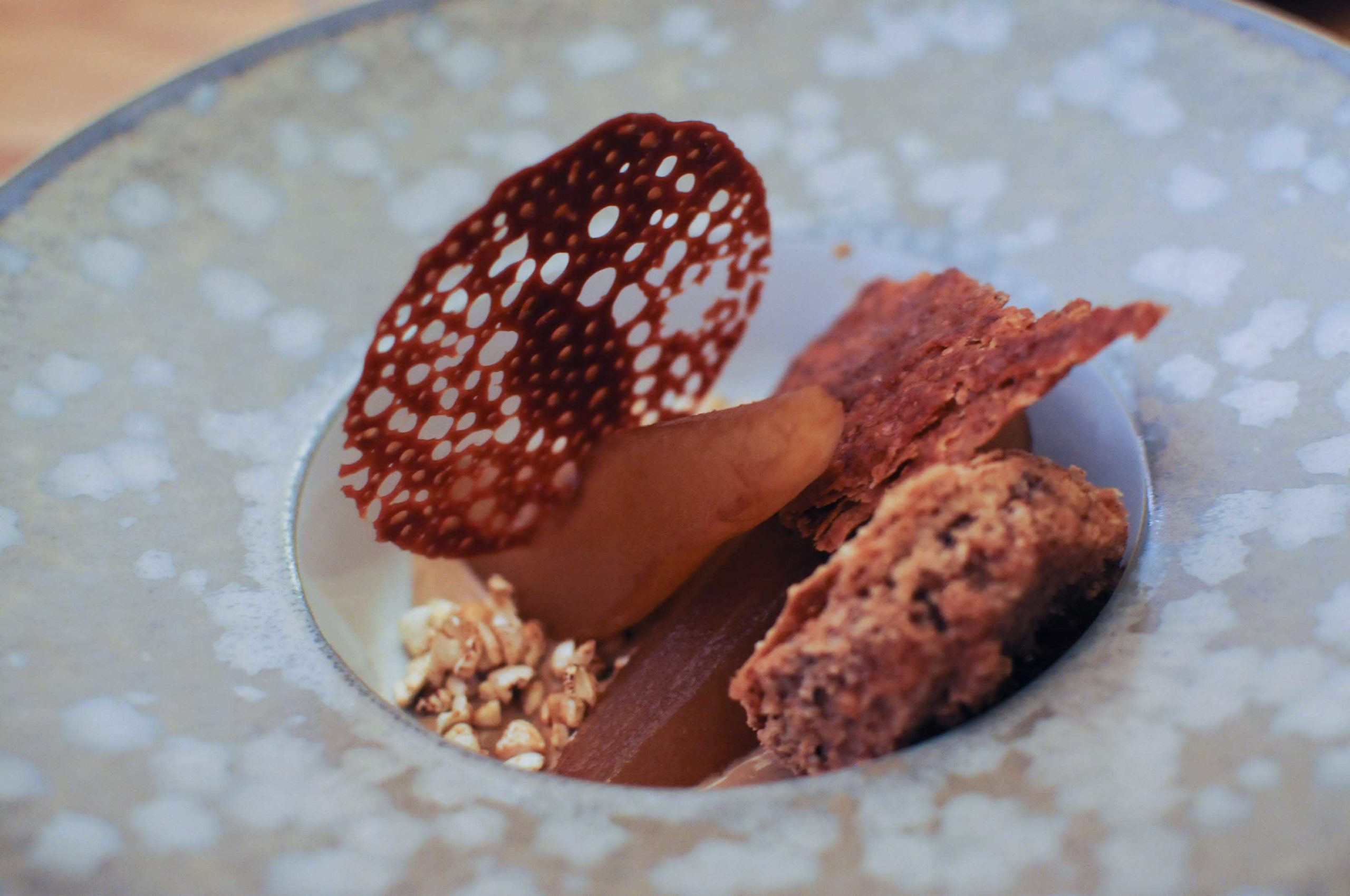 Tout chocolat: ganache, crumble, biscuit datte, noix, figue pochée, siphon riz Arborio et sorbet choco/raisin muscat