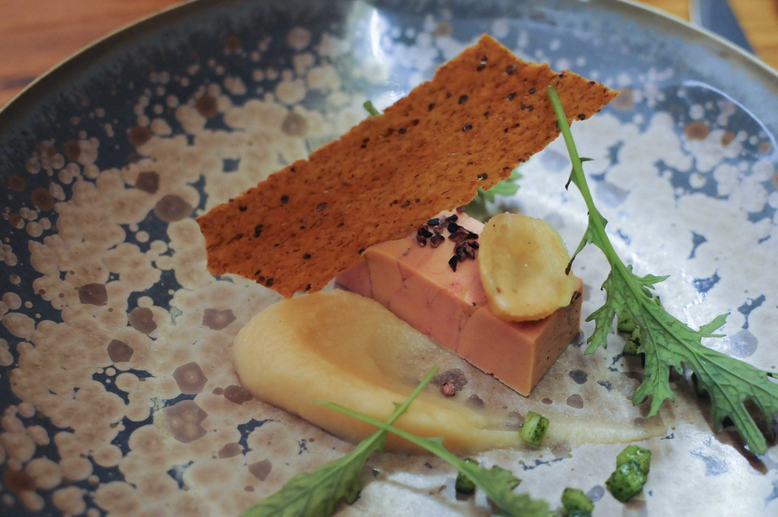 Foie gras mi-cuit maison, crémeux au coing, goyave feijoa et tuile de Lavash