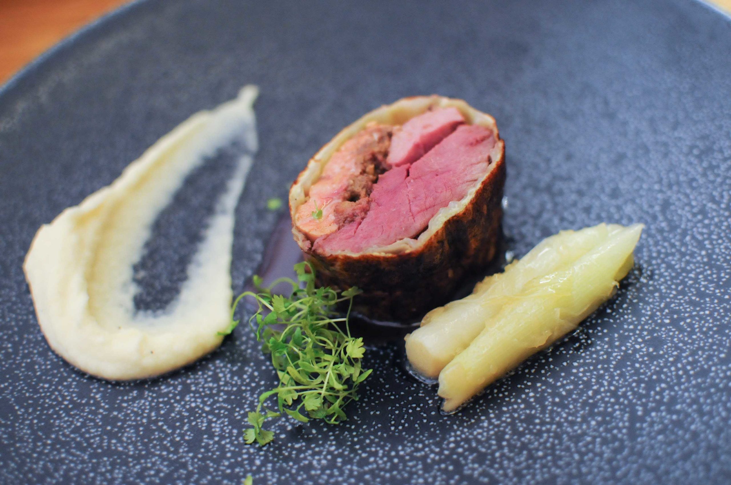 Grouse d’ Ecosse marinée au malt tourbé, farce fine de volaille, cèpe, foie gras frais, jeunes poireaux étuvés, purée de betterave blanche et huile d’amandon