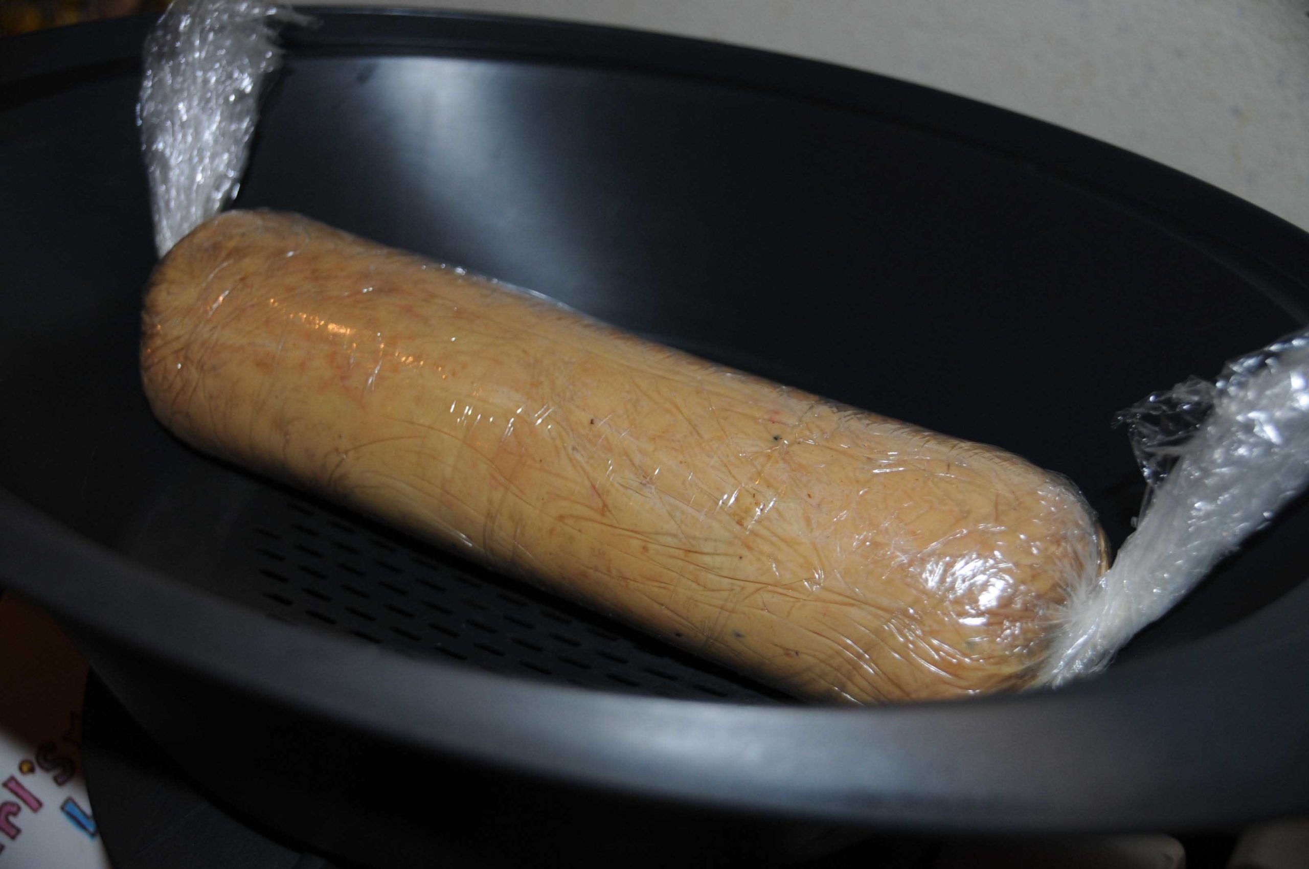 Assaisonner alors le foie avec sel et poivre . Reconstituer en forme de boudin et envelopper dans du film étirable en serrant bien. Percer le film avec un cure dents à plusieurs endroits afin que le gras s’écoule à la cuisson.