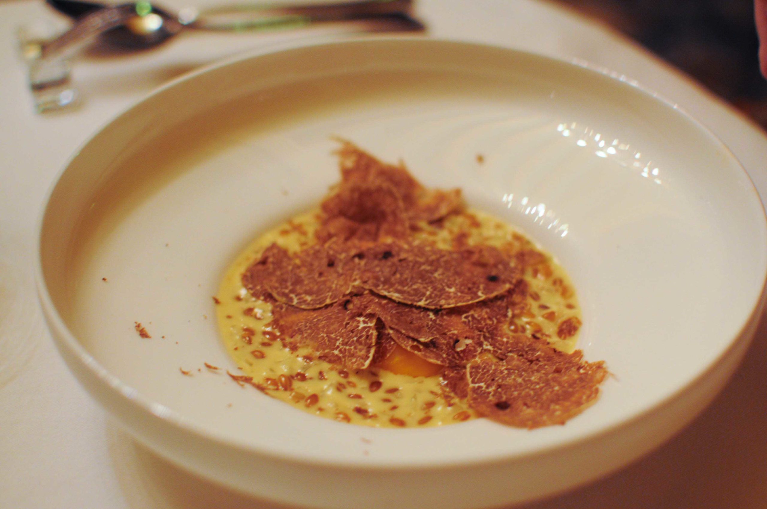 Jaune d’oeuf, épeautre, ricotta et truffe blanche d’Alba