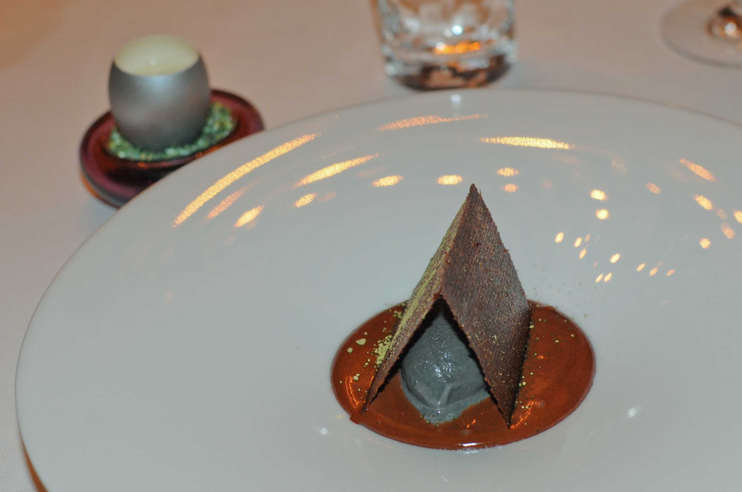 On retrouve dans ce plat des influences asiatiques avec le yuzu et le tonburi aussi appelé caviar des champs (ce sont des graines perlées sombres avec une texture craquante en bouche dont le goût rappelle celui de l’artichaut et qui excellent avec le poisson). La cuisson du lieu est absolument parfaite, la salicorne diffuse son goût iodé et non agressif, l’ensemble est un mélange de délicatesse et de douceur avec beaucoup de sensualité en bouche. Excellent.