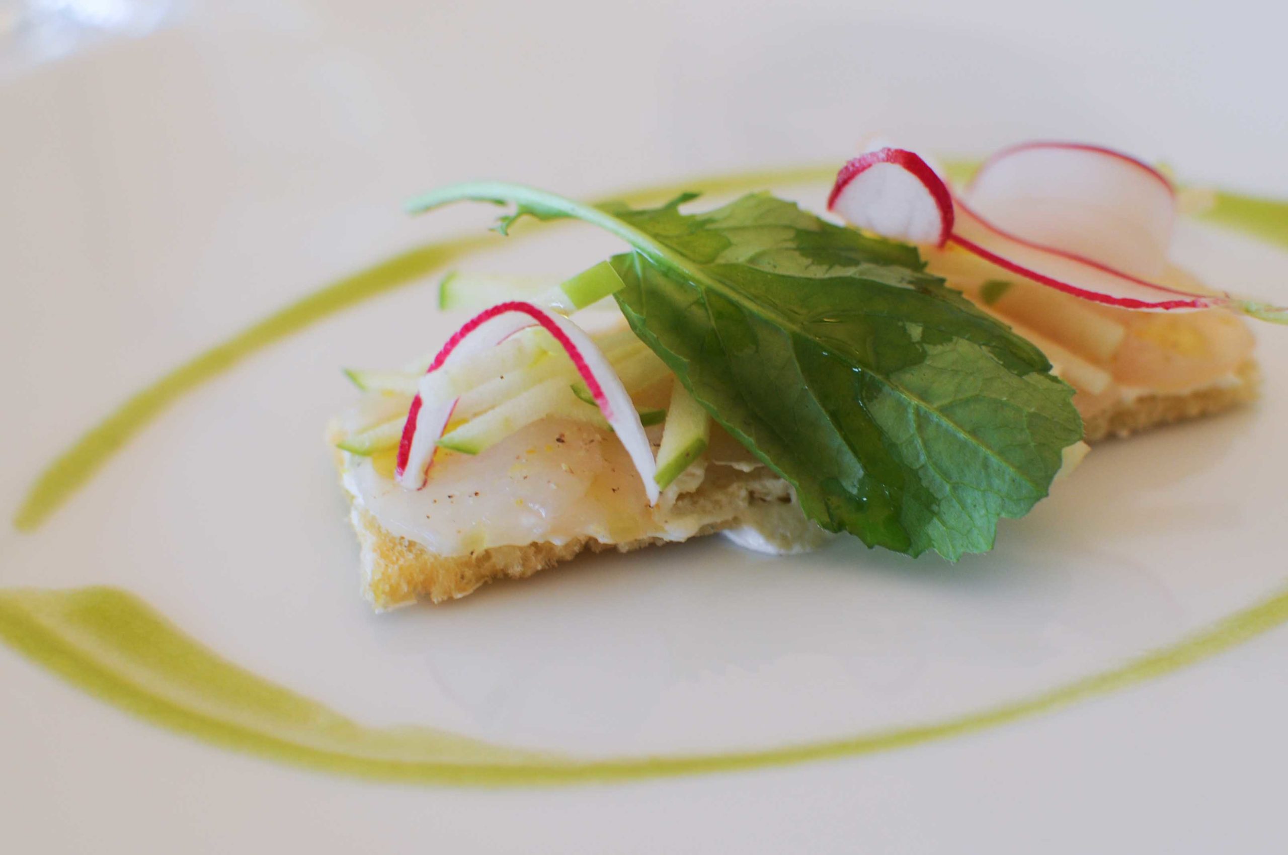 Les Saint-Jacques sont coupées en carpaccio sur une fine tranche de pain de seigle. Pommes vertes, wasabi léger, crème fraîche, couleur, acidité, des associations qui marchent bien.