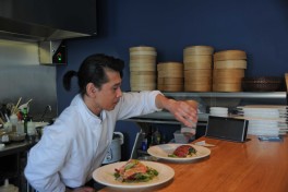 Nous avons eu un assortiment de dim sum au porc et châtaignes d’eau (saveurs cambodgiennes), dim sum au saumon, citronnelle et lait de coco (saveurs asiatiques) et dim sum au canard, butternut et épices (saveurs du terroir)… comme quoi la cuisine asiatique et les produits du sud-ouest font très bon ménage.