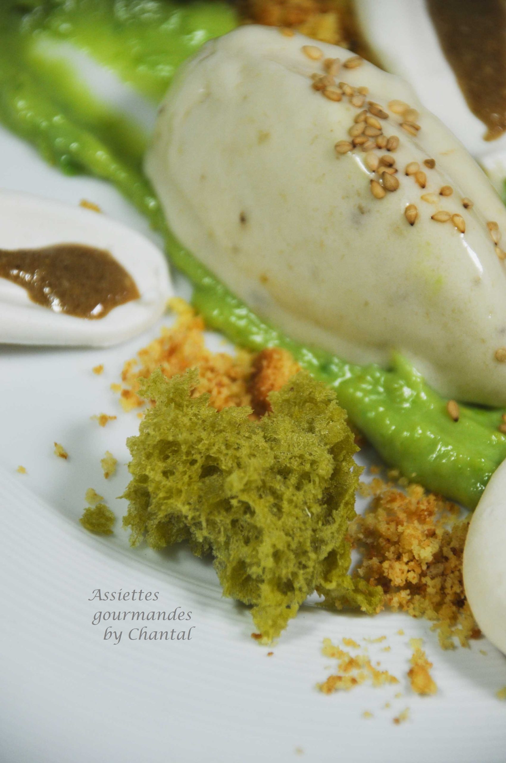 J’ai apporté ma petite touche et le résultat est une assiette dessert composée de glace banane, ganache chocolat blanc avocat, meringue, crumble, crème de sésame et Sponge Cake à la pistache.