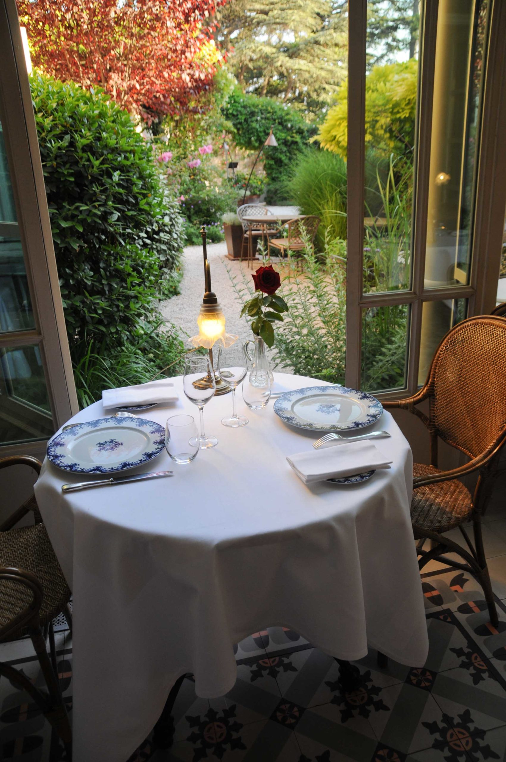 Au fond de la cour fleurie et baignée de verdure, la verrière lumineuse abrite le restaurant gastronomique qui a été honoré d’une étoile au Michelin en 2015.