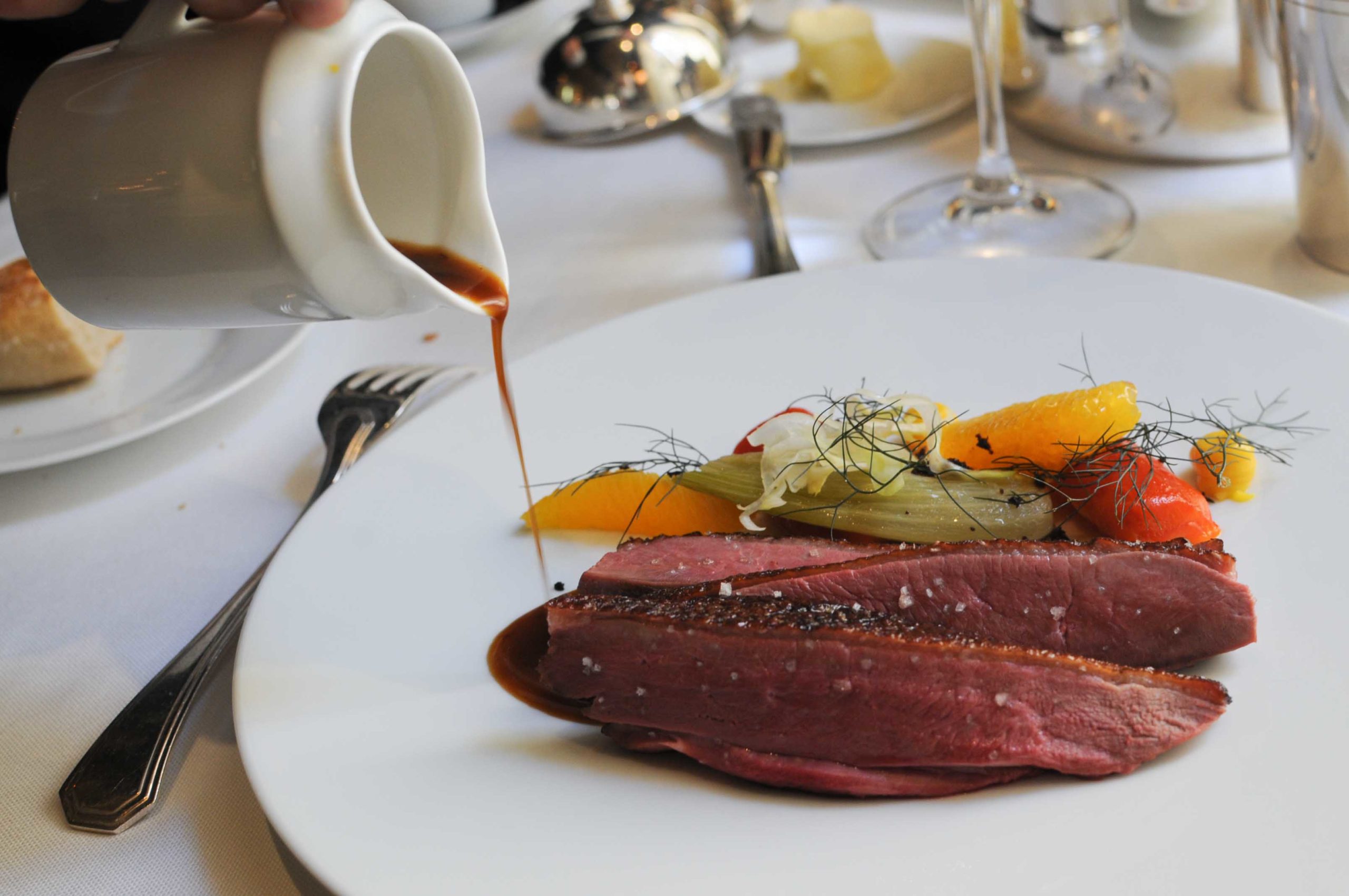 Canette rôtie sur le coffre, poivrons confits dans un jus de poivrons et farcis avec des courgettes, purée de zestes d’oranges, pâte d’orange et suprêmes d’orange; très belle cuisson, des mariages de saveurs qui fonctionnent parfaitement, c’est excellent.