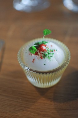 Un plat tout en douceur, légèrement sucré; la langoustine se cache sous une raviole de manioc, le lait de poule est aromatisé au mirin et au cumin, un condiment au piment est ajouté sur le côté, quelques pétales de fleur de soucis… on se laisse aller dans ce voyage qui nous en met plein les yeux et plein les papilles.