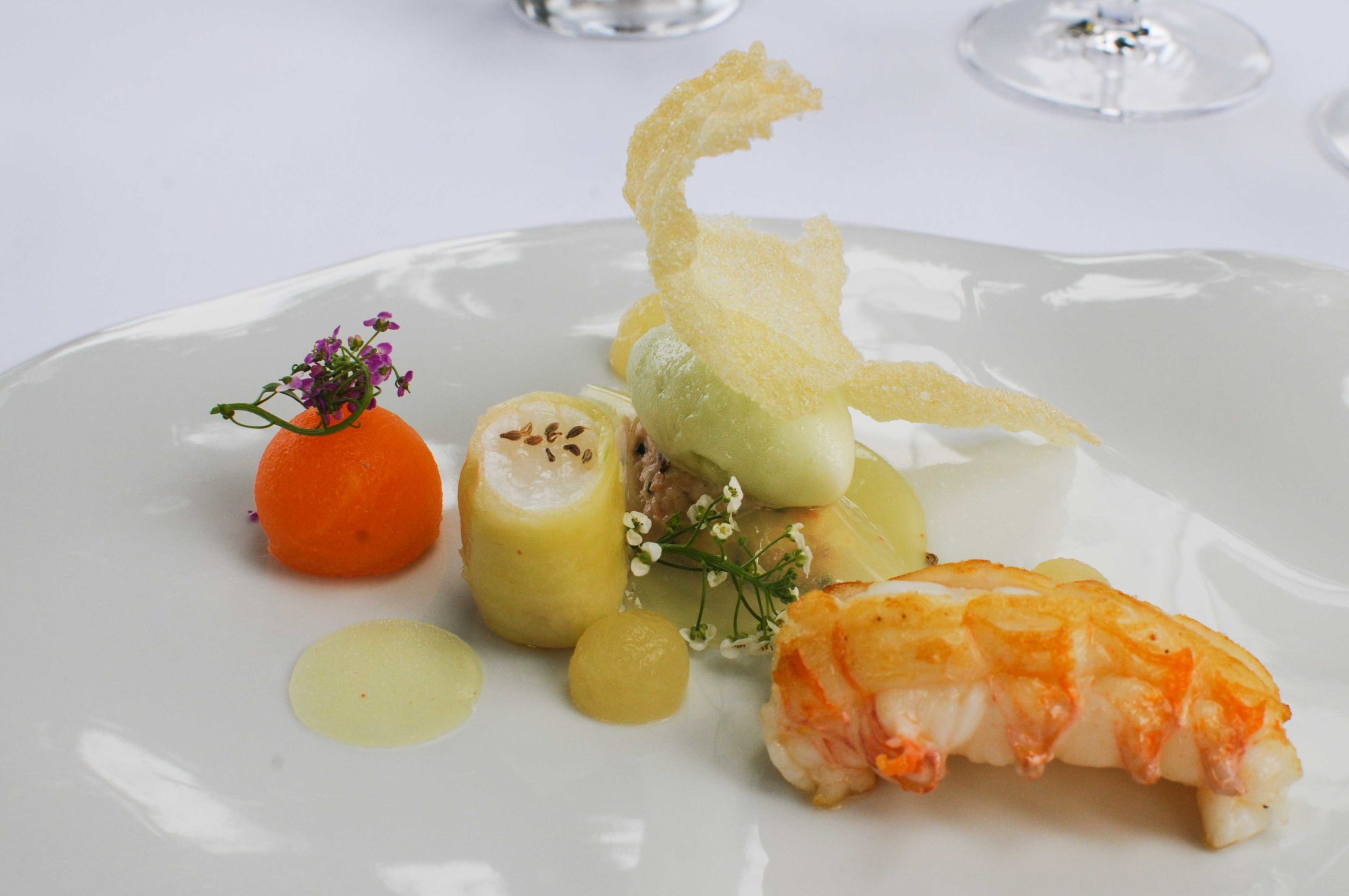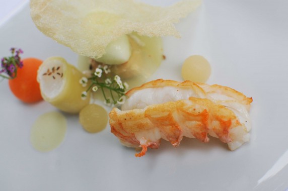 La star c’est le homard bien sur, il est ici subtilement relevé par un mélange d’épices; délicat en bouche , j’adore entre autres cette association avec les framboises, le côté fruité et acidulé en fait une petite merveille et un grand moment.