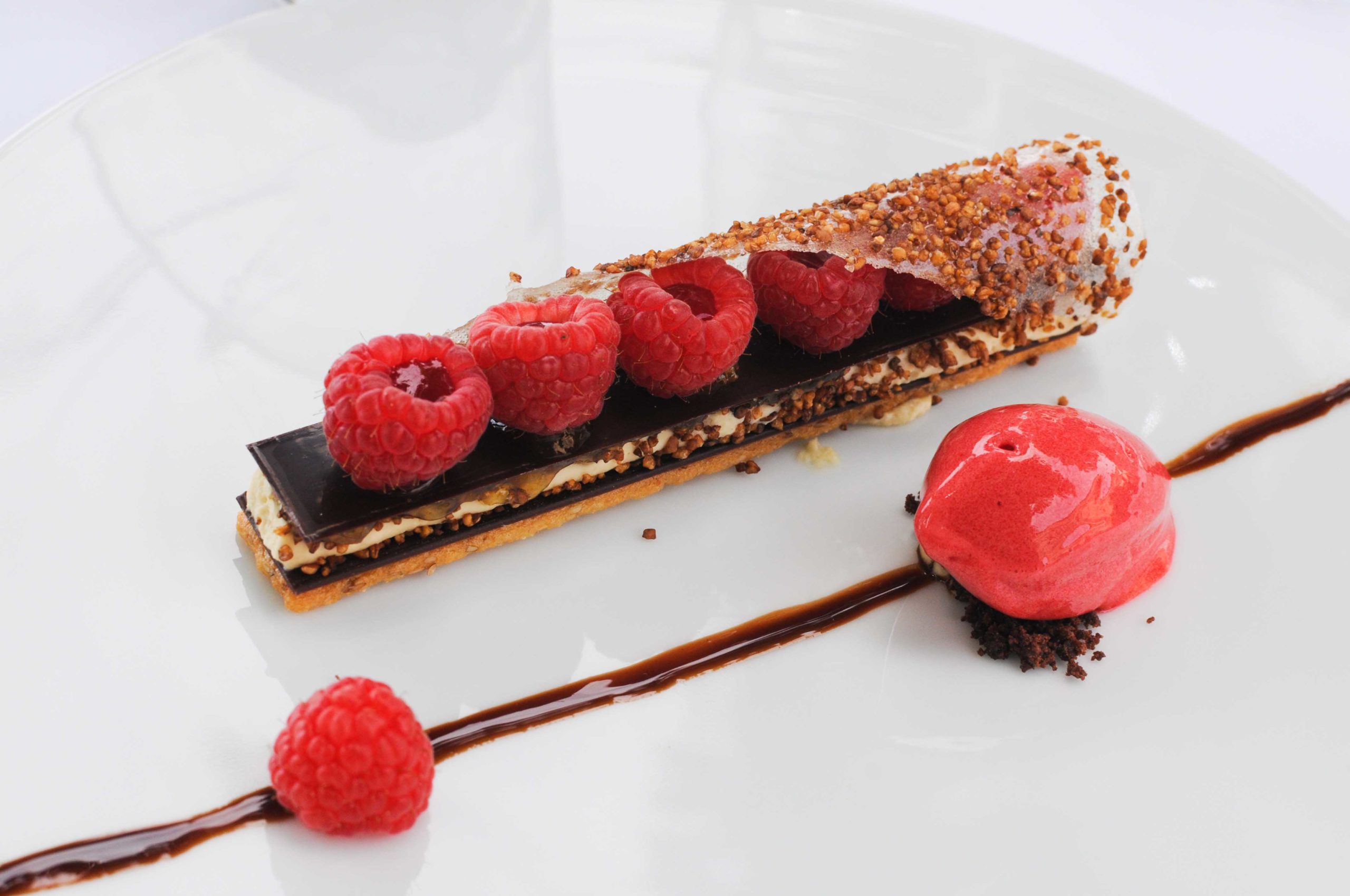 Framboise : sablé breton et chocolat Guanaja à la fleur de sel, sarrasin torréfié, café brûlé et sorbet framboise