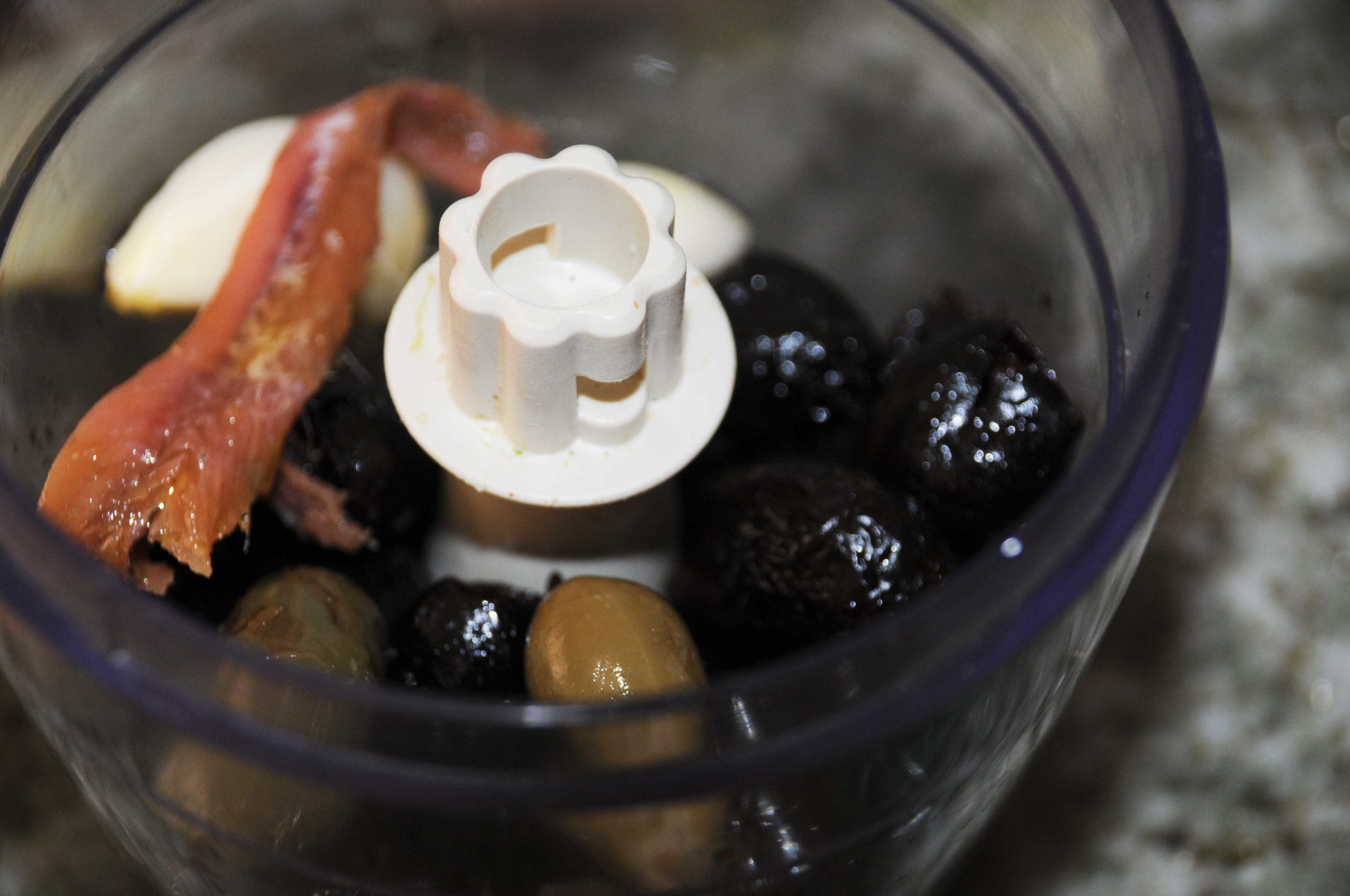Tapenade: 100 g d’olives noires dénoyautées, 2 anchois, 1 cuil. à s. de câpres, 3 cuil. à s. d’huile d’olive