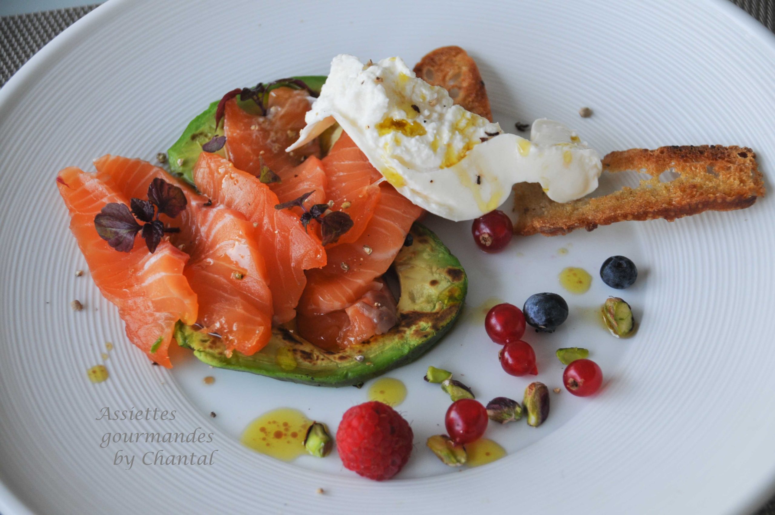 Saumon gravlax, avocat grillé, fruits rouges![]()