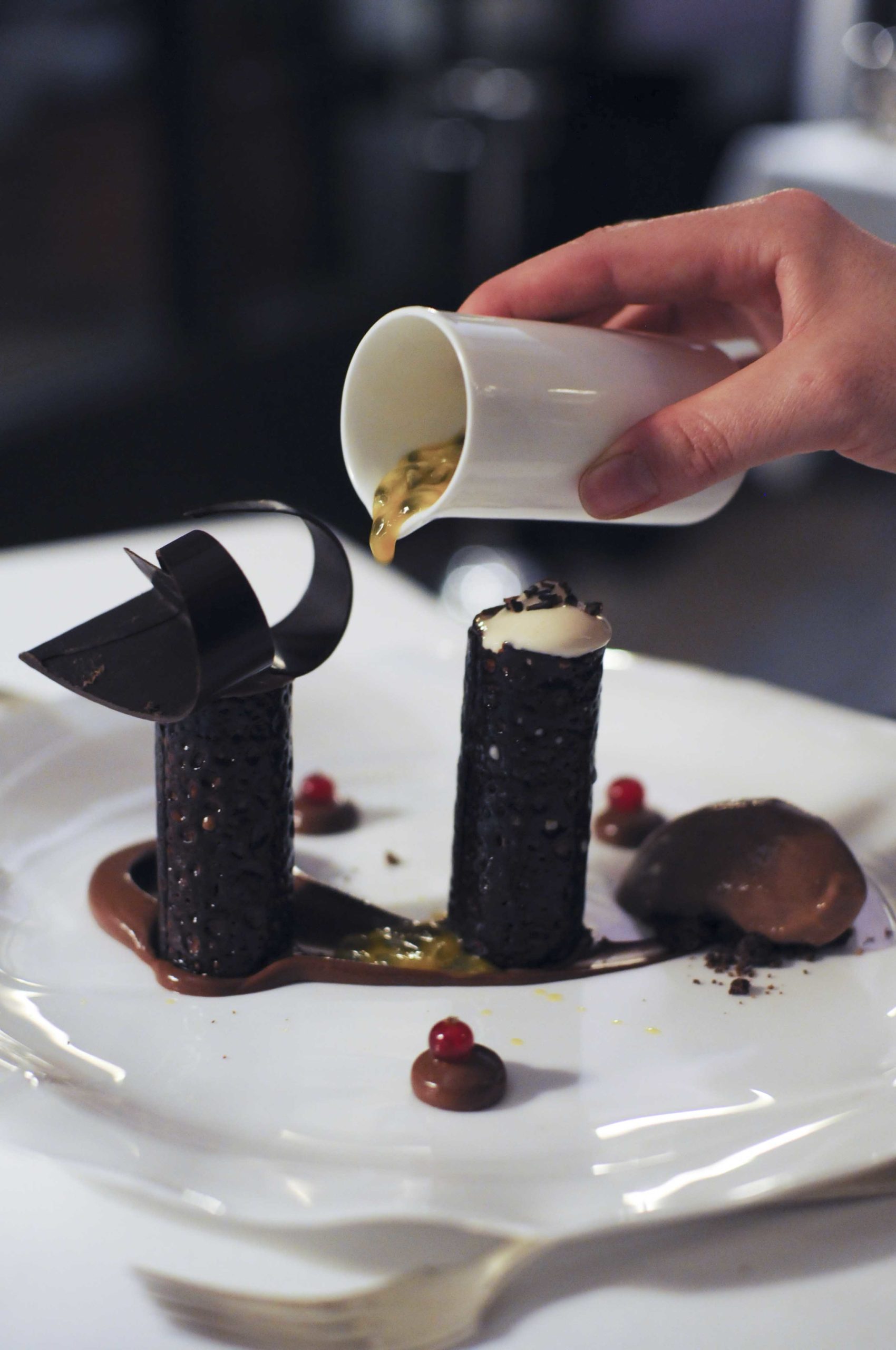 Crémeux chocolat Manjari, tube chocolat caramel, streusel, sorbet cacao, émulsion au grué de cacao et fruit de la passion… voilà, vous savez tout!