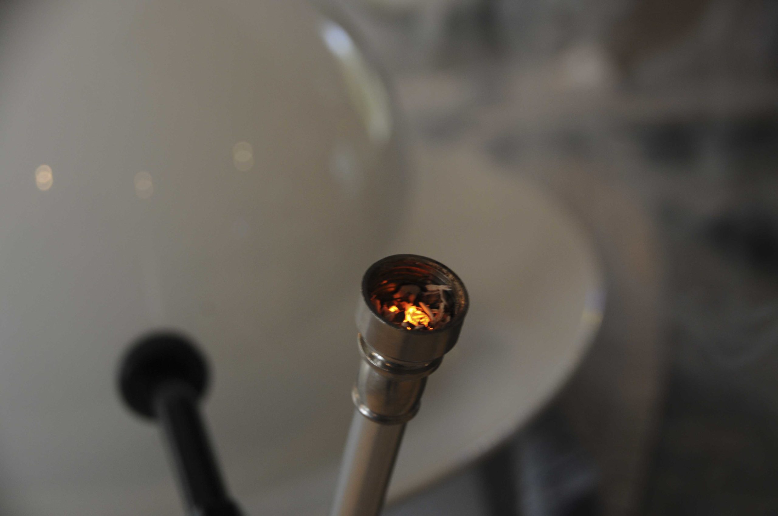 Déposer les châtaignes cuites dans une assiette, couvrir avec une cloche et fumer avec une pipe fumoir (pour info, la cloche en verre est prévue à cet effet et présente un petit trou pour introduire le tuyau qui envoie la fumée). Laisser ainsi les châtaignes couvertes pendant 15/20 minutes.