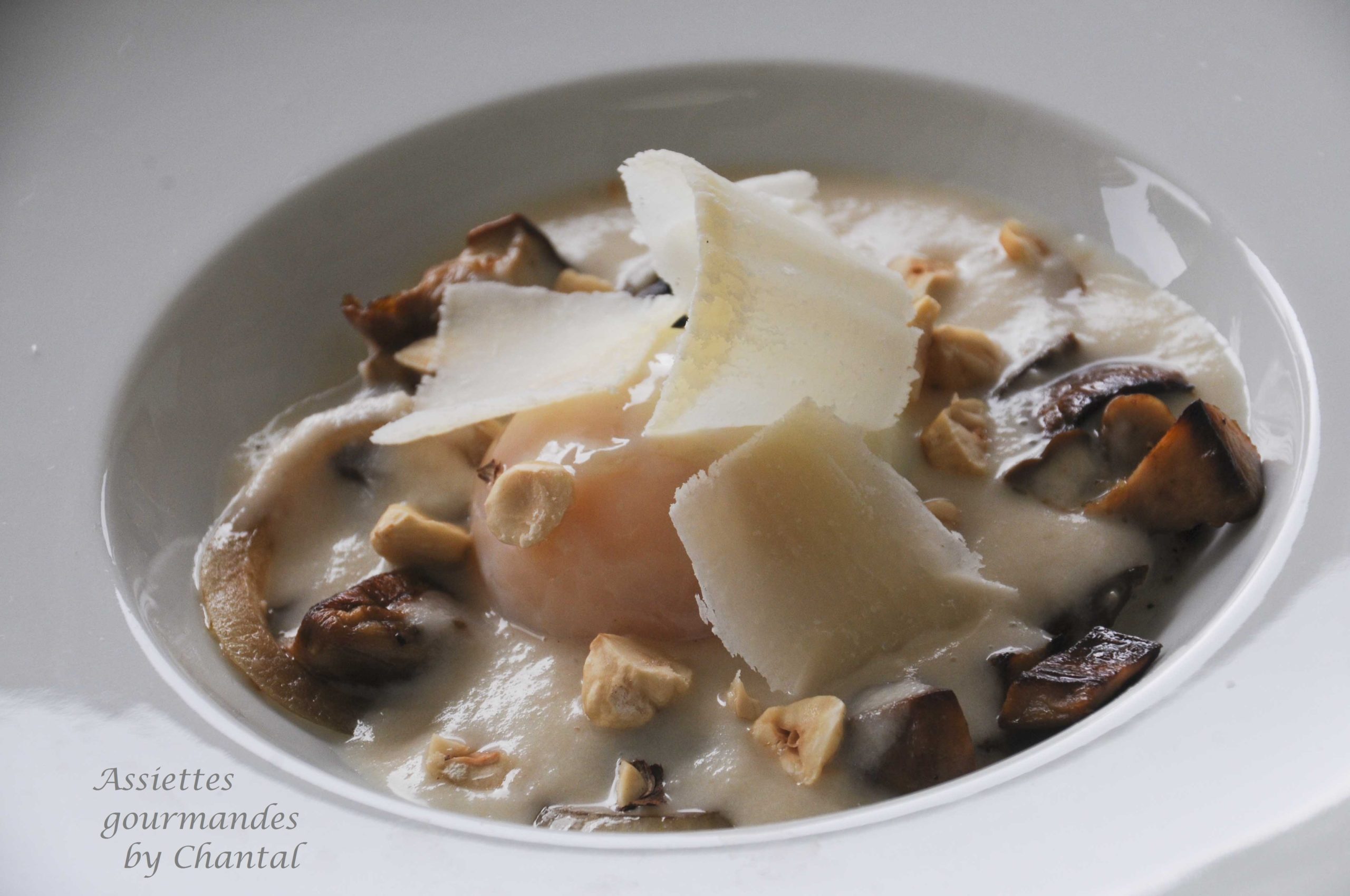 Réchauffer le bouillon d’oignons et le verser autour de l’oeuf. Terminer avec quelques copeaux de Parmesan et quelques noisettes grillées et concassées… ou de la truffe fraîche 😉