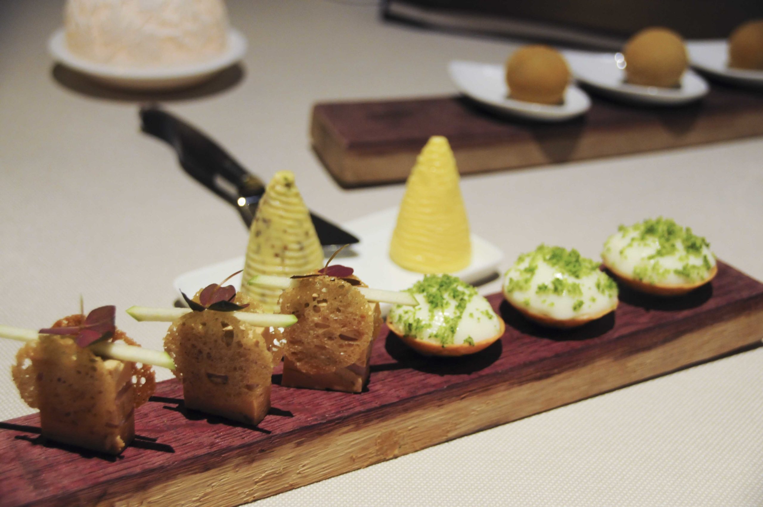 Foie gras esturgeon fumé; tartelettes émulsion chou-fleur; croustillant châtaigne et foie gras