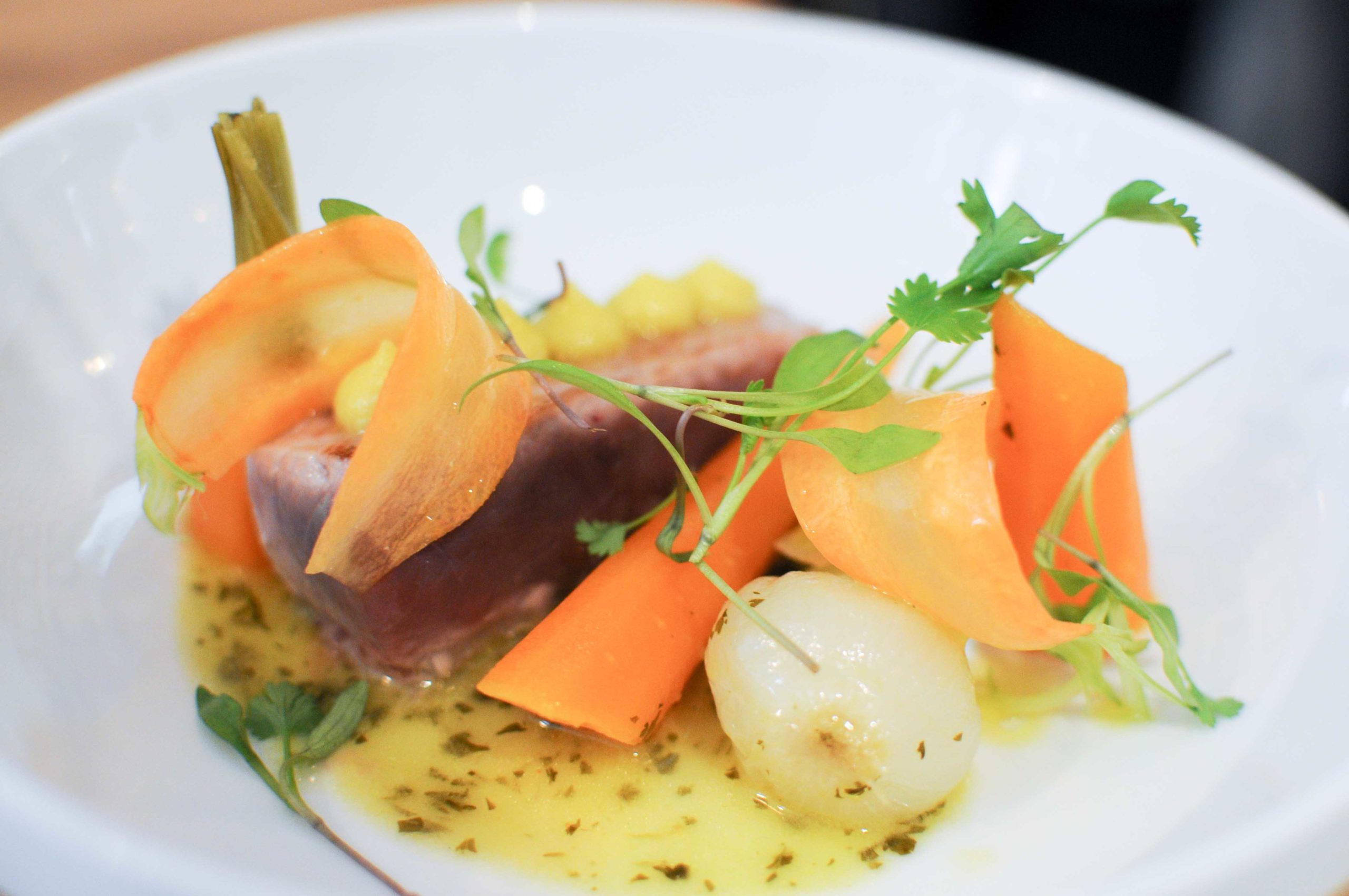 La photo parle d’elle-même concernant la cuisson parfaite du thon, carottes et oignons nouveaux sont cuisinés à la grecque mais à la façon du Chef (il garde son secret ^_^), condiment aux agrumes, pousses de coriandre… joli mélange.