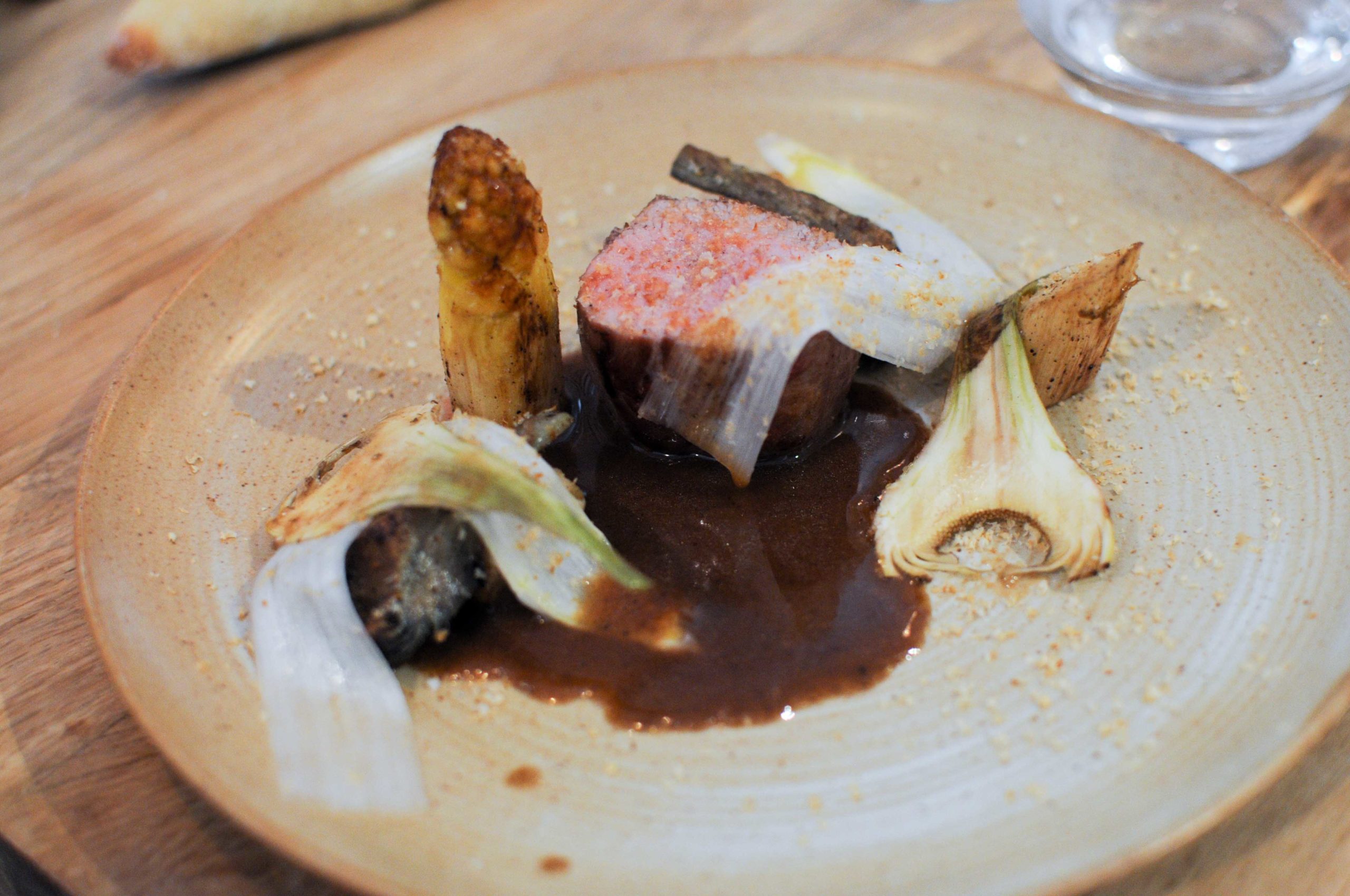 Cuisson impeccable des gambas, jeunes poireaux très tendres pour accompagner et un condiment audacieux à base de rhubarbe, fraise et estragon. Un très bel équilibre de saveurs, c’est très bien assaisonné et maîtrisé, top!