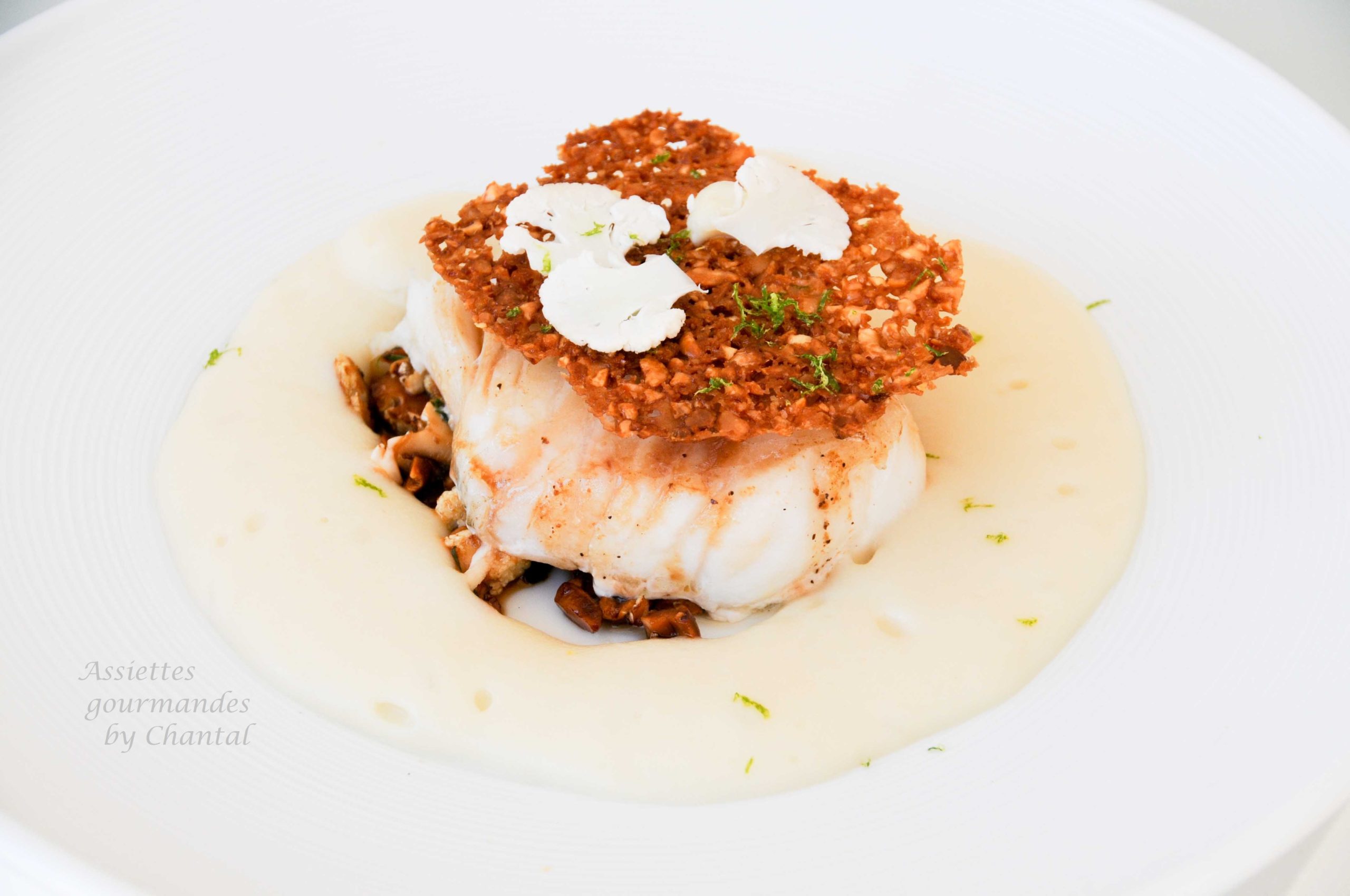 Répartir le condiment cacahuètes/chou-fleur au fond des assiettes. Poser un morceau de poisson, une tuile et garnir avec la mousse de chou-fleur chaude.
