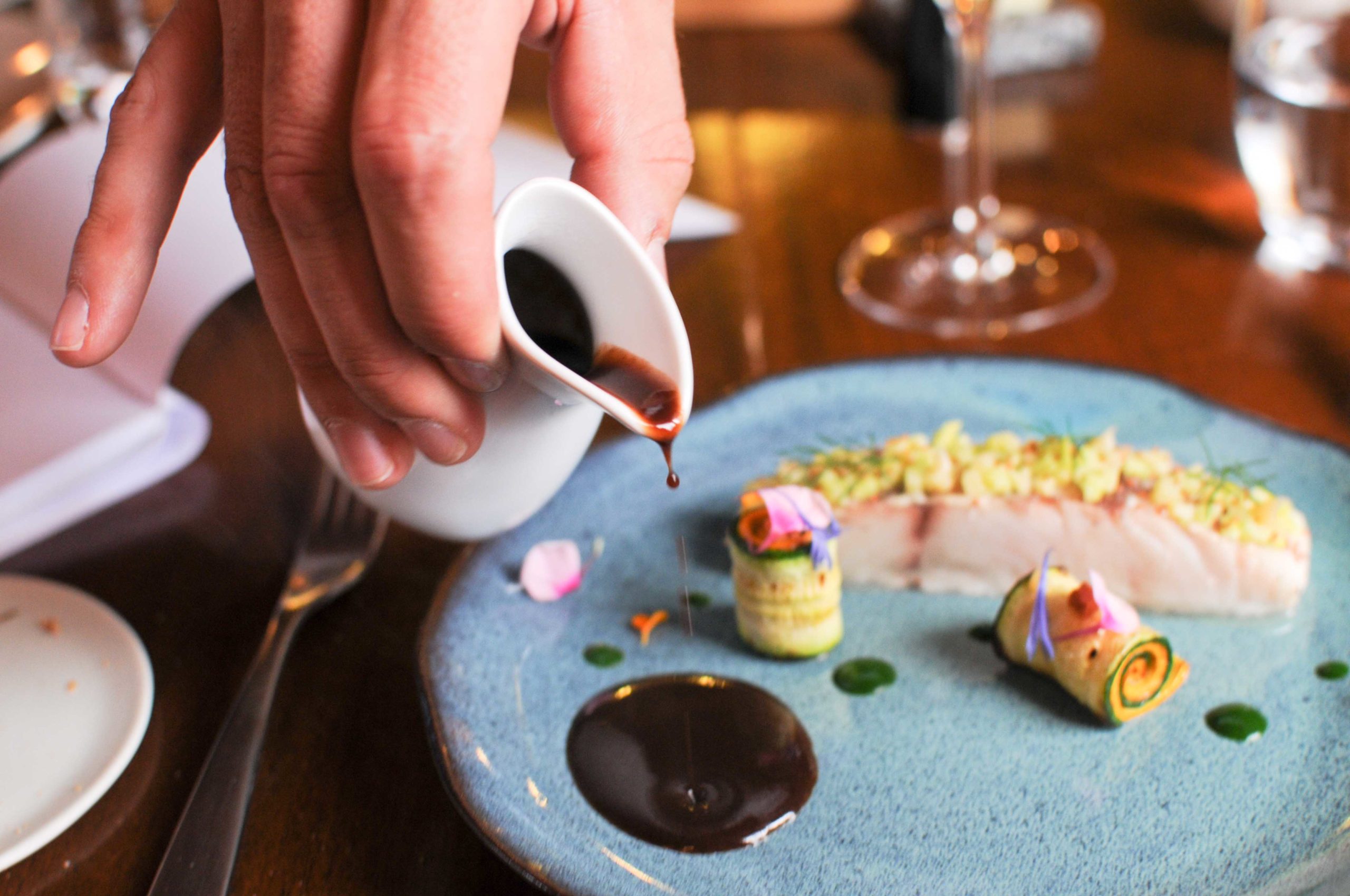 Magnifique cuisson de la féra rehaussée d’une croûte de pain. Clin d’oeil à la Provence avec une soupe de poisson en miroir qui rappelle la bouillabaisse (saveurs de safran et d’anis), rouille et chlorophylle d’estragon, c’est très raffiné, un camaïeu gustatif très apprécié.