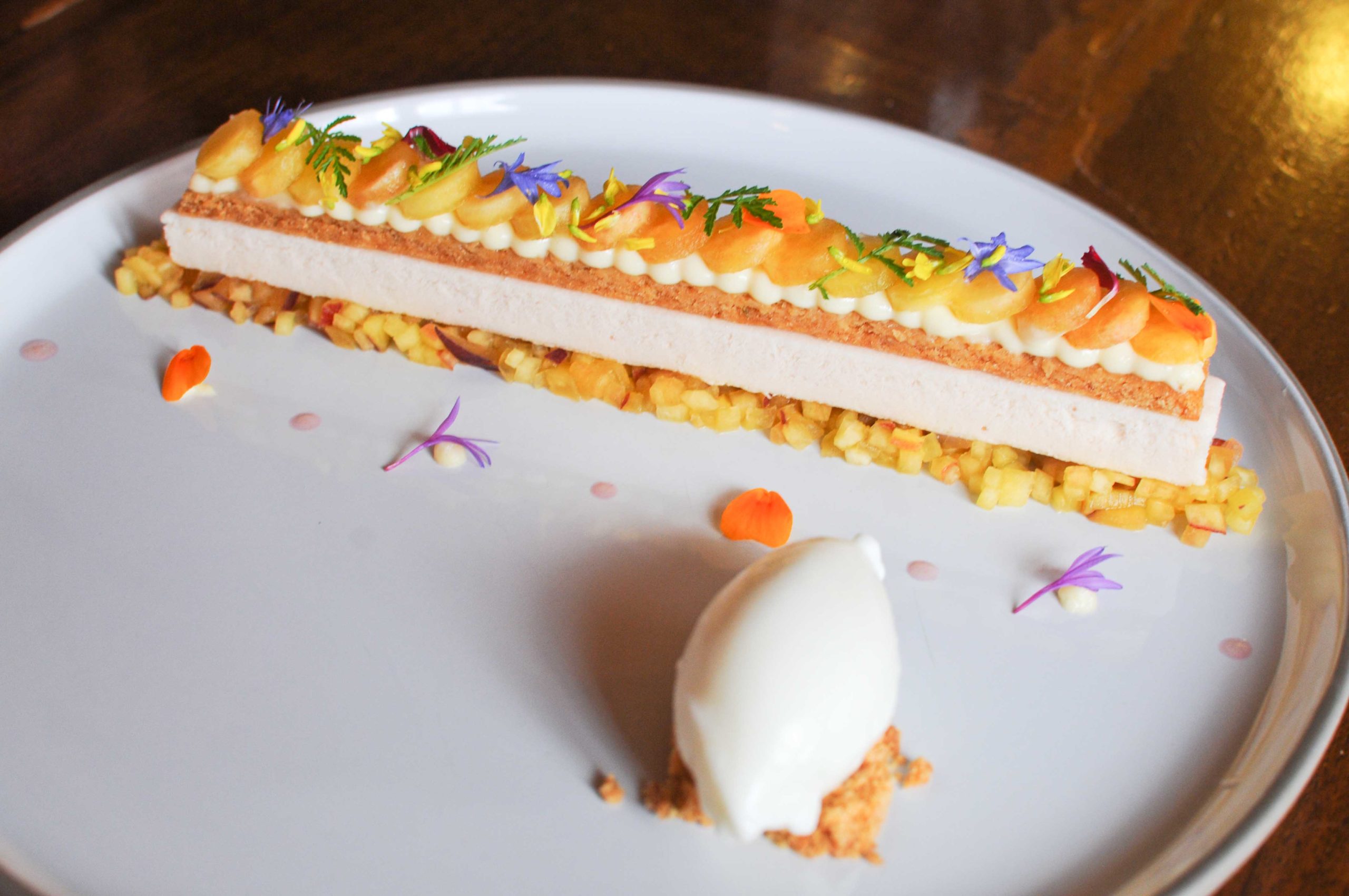Brunoise, parfait glacé, biscuit sablé, mousse à la pêche, crème glacée yuzu citron… Le plaisir est bien là, c’est frais, lacté, peu sucré, un dessert comme on aime, avec des saveurs franches et élégantes.