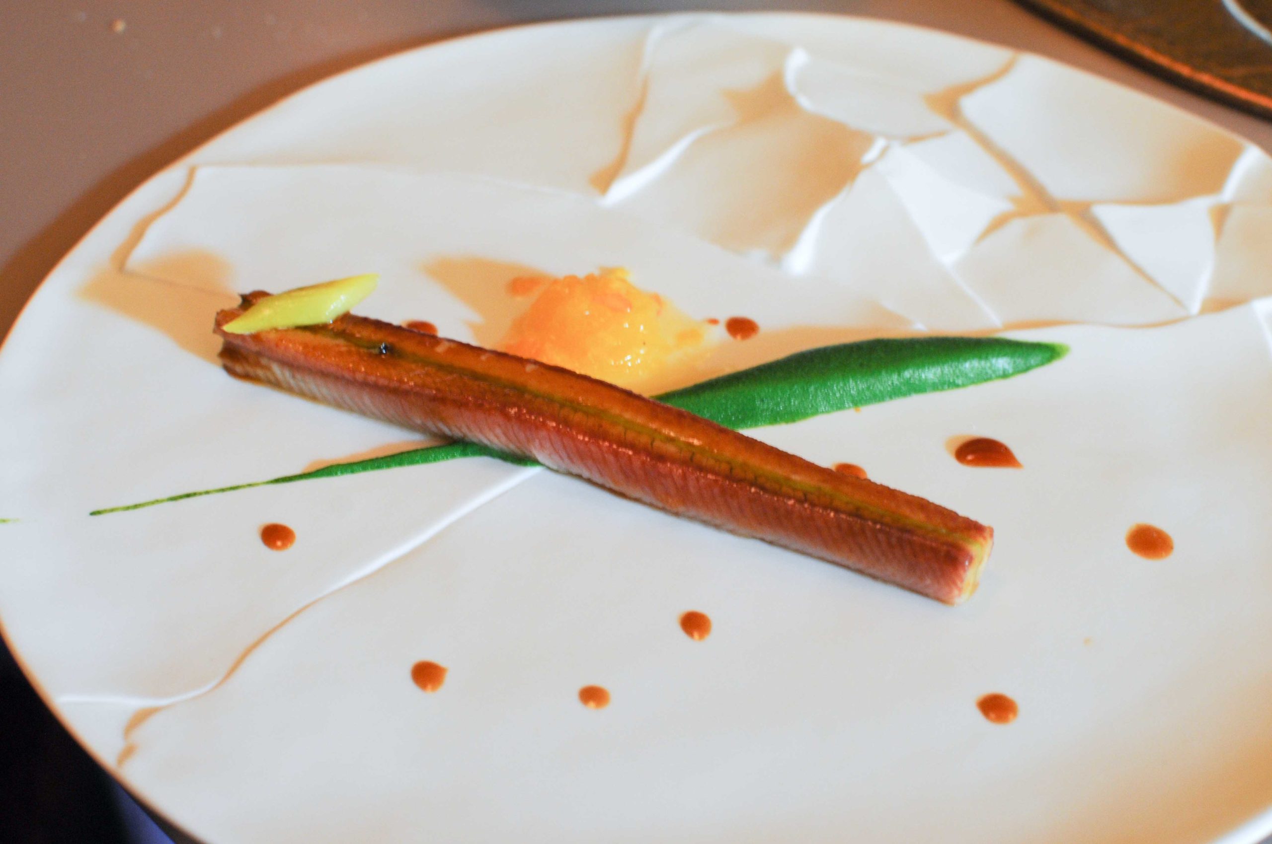 Filet d’anguille légèrement fumée, laquée aux agrumes, fine mousseline de poireaux