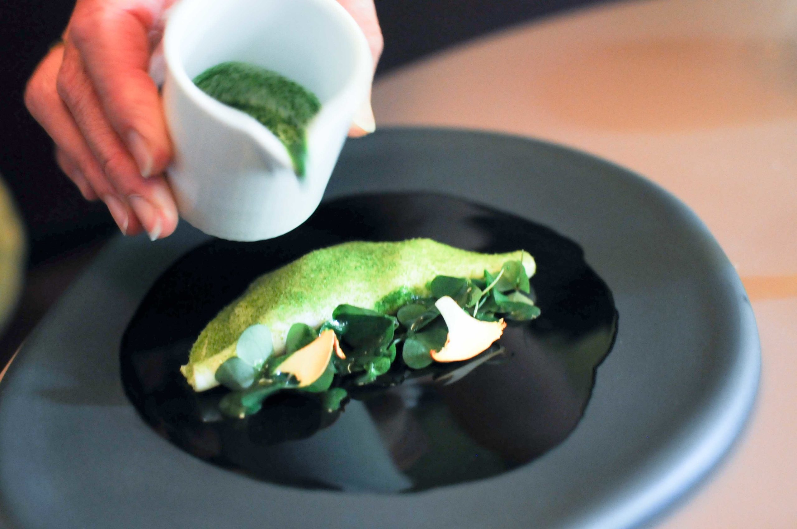 Un plat technique et raffiné, qui laisse un souvenir à jamais! Le principe de l’ Ikejime est une technique d’abattage d’origine japonaise, le poisson vivant est complètement vidé de son sang pour une qualité optimale. La chair est très blanche, beaucoup plus ferme, et la saveur exceptionnelle, un must. Une très fine croûte de persil, une crème babeurre au caviar de la Maison Petrossian… Perfection d’une oeuvre longuement murie, c’est juste E-NOR-ME !