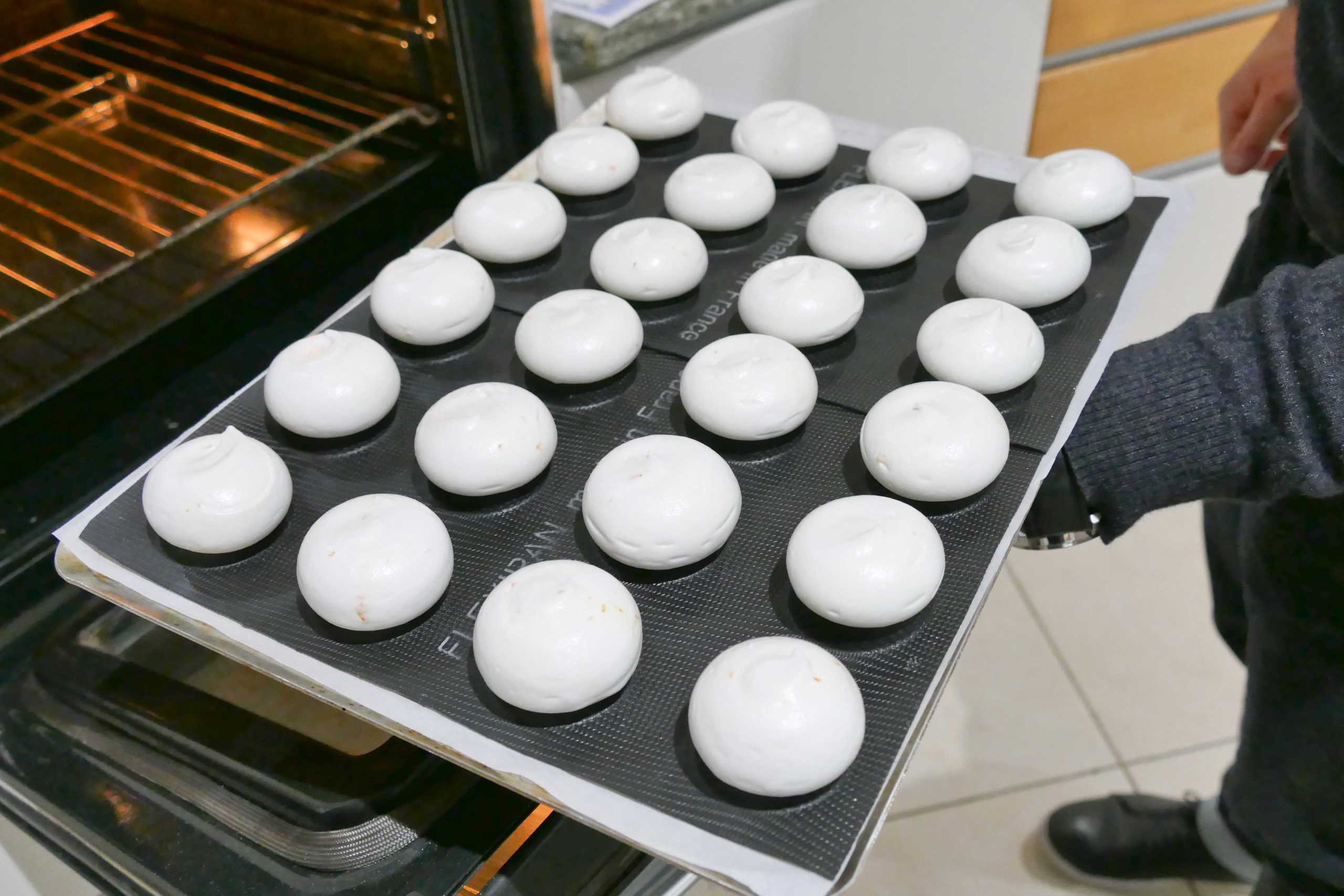 Mettre dans une poche à douille unie et pocher sur l’envers d’un moule silicone de forme 1/2 sphère (diamètre environ 4,5 cm). Pocher au centre du sommet de la 1/2 sphère pour que la meringue glisse uniformément sur les côtés.