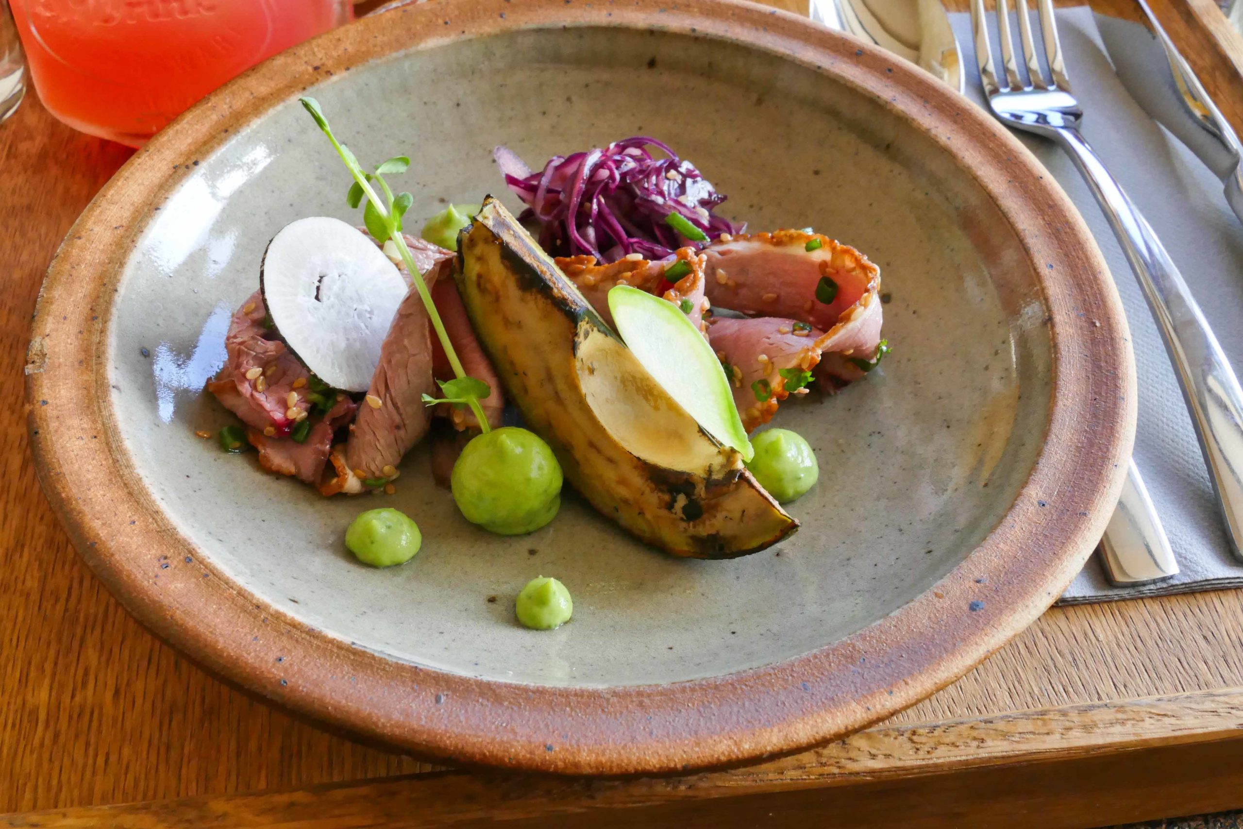 Magret à l’asiatique mariné dans une sauce soja, sésame, citron et gingembre, avocat juste grillé, radis daikon et radis green meat (beaucoup plus doux)… une belle entrée qui nous fait déjà craquer avec son guacamole au vinaigre de mangue et sa petite salade de chou rouge. Excellent.