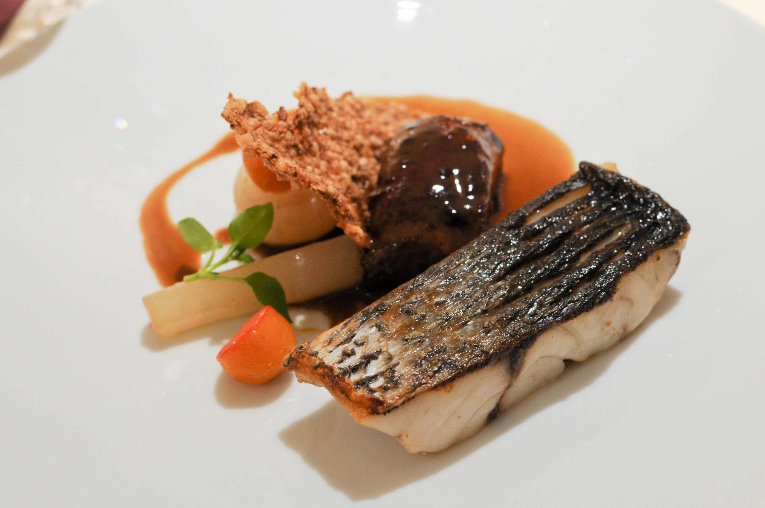 Maigre, joue de porc, réduction de vin rouge et légumes oubliés