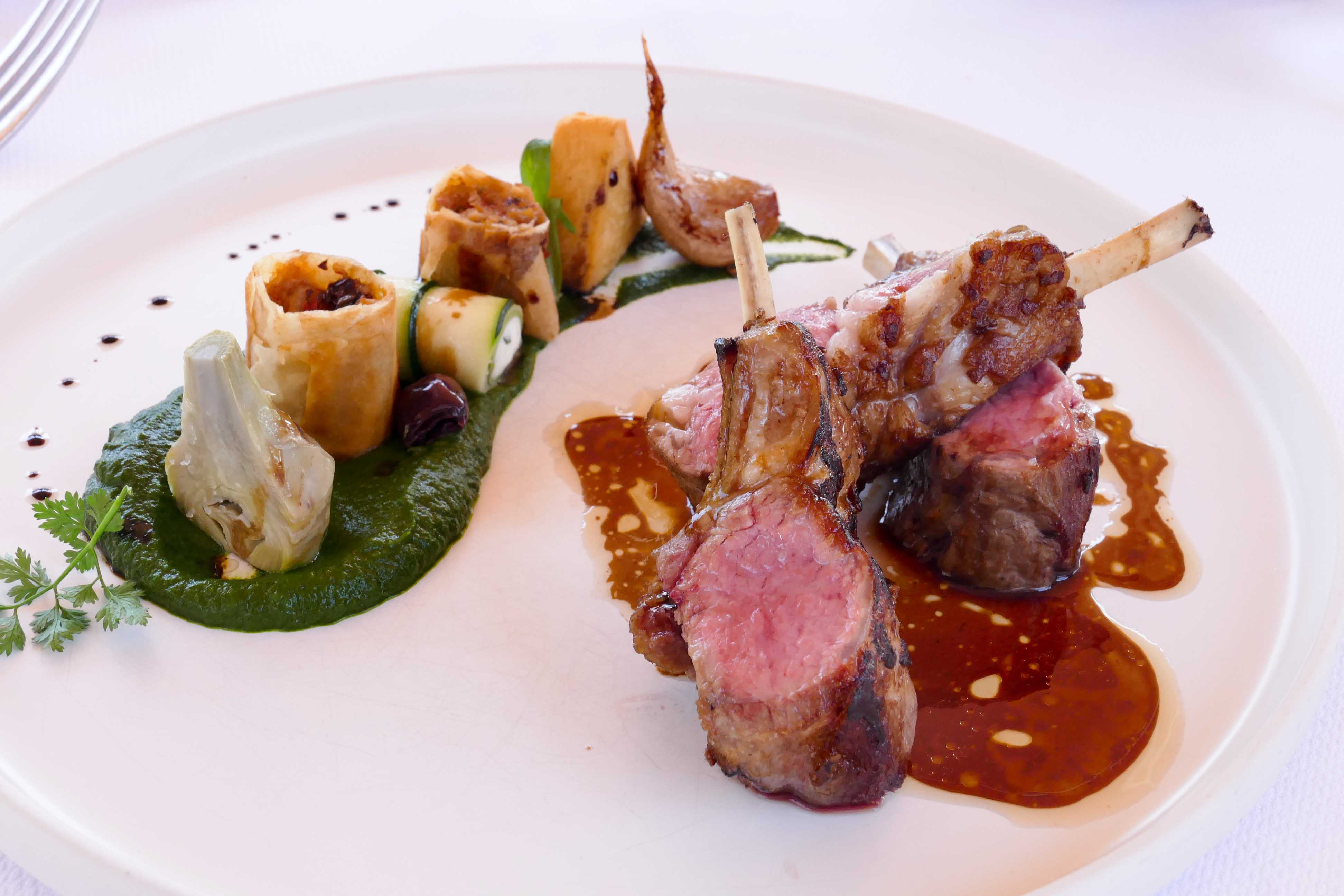 Le carré d’agneau rôti à la broche, croustillant de pieds paquets au crémeux de roquette, panisse provençale au jus