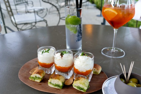 Michel nous propose de nous faire découvrir plusieurs plats de sa Carte lors de 2 repas (1 pris à l’intérieur et le second en terrasse), nous lui faisons confiance (tous les détails de la Carte de la Cabro d’Or ici)