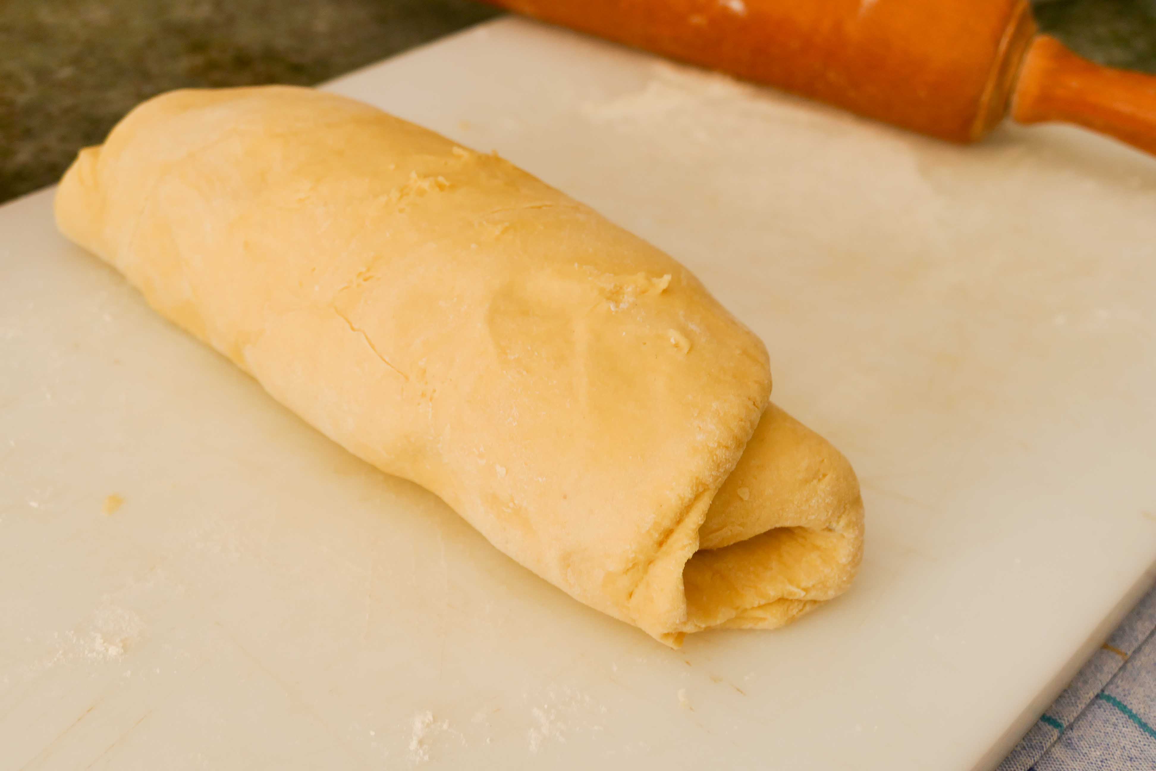 Le lendemain, déposer un peu de farine sur le plan de travail et renverser la pâte. Étaler au rouleau en forme de rectangle sur une épaisseur d’environ 1 cm. Rouler la pâte sur elle même; faire cette opération 3 fois en faisant 1/4 de tour entre chaque.