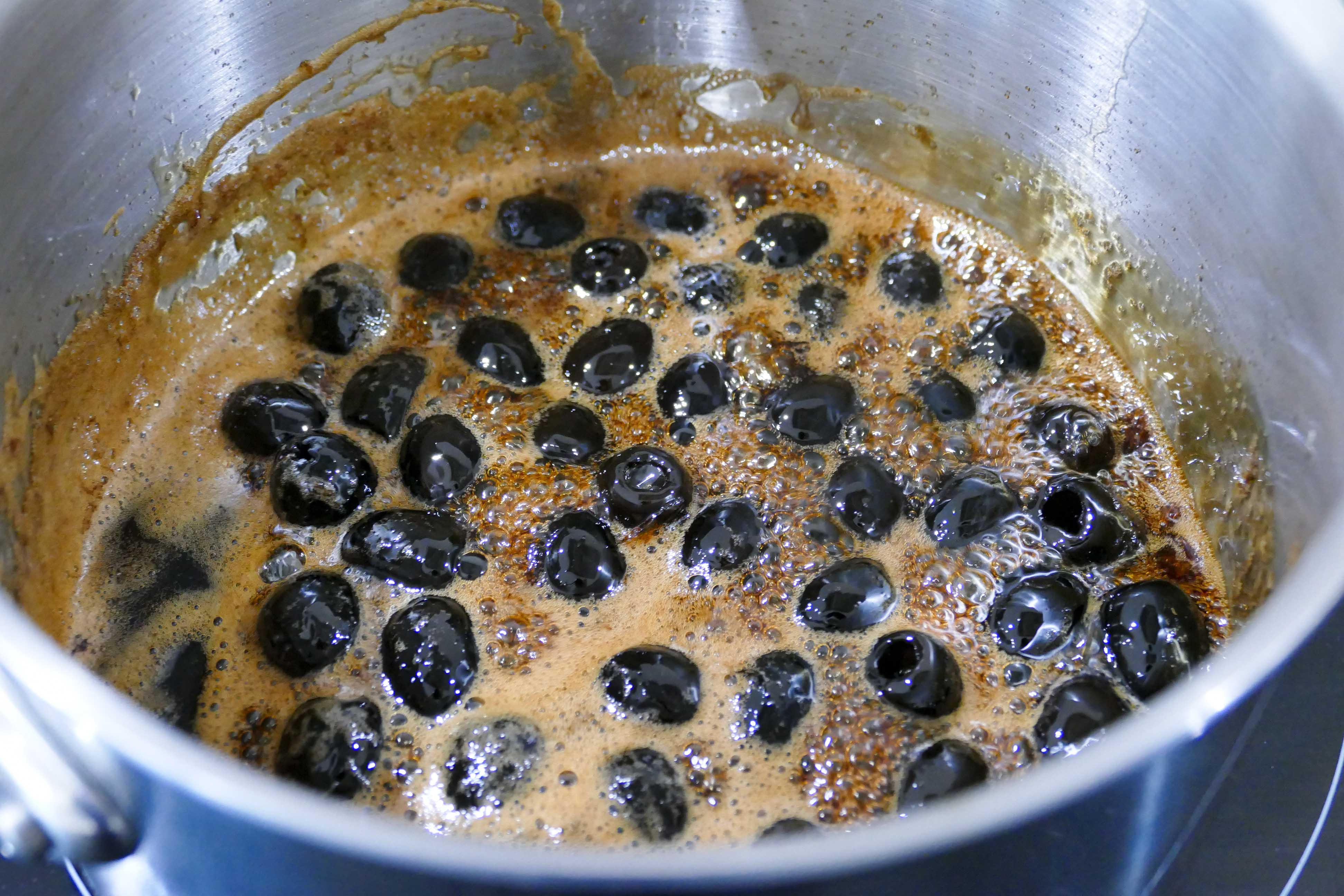 NB: il vous restera de la confiture d’olives noires et du crumble ; ça se garde très bien dans un bocal fermé au frigo pour d’autres utilisations.
