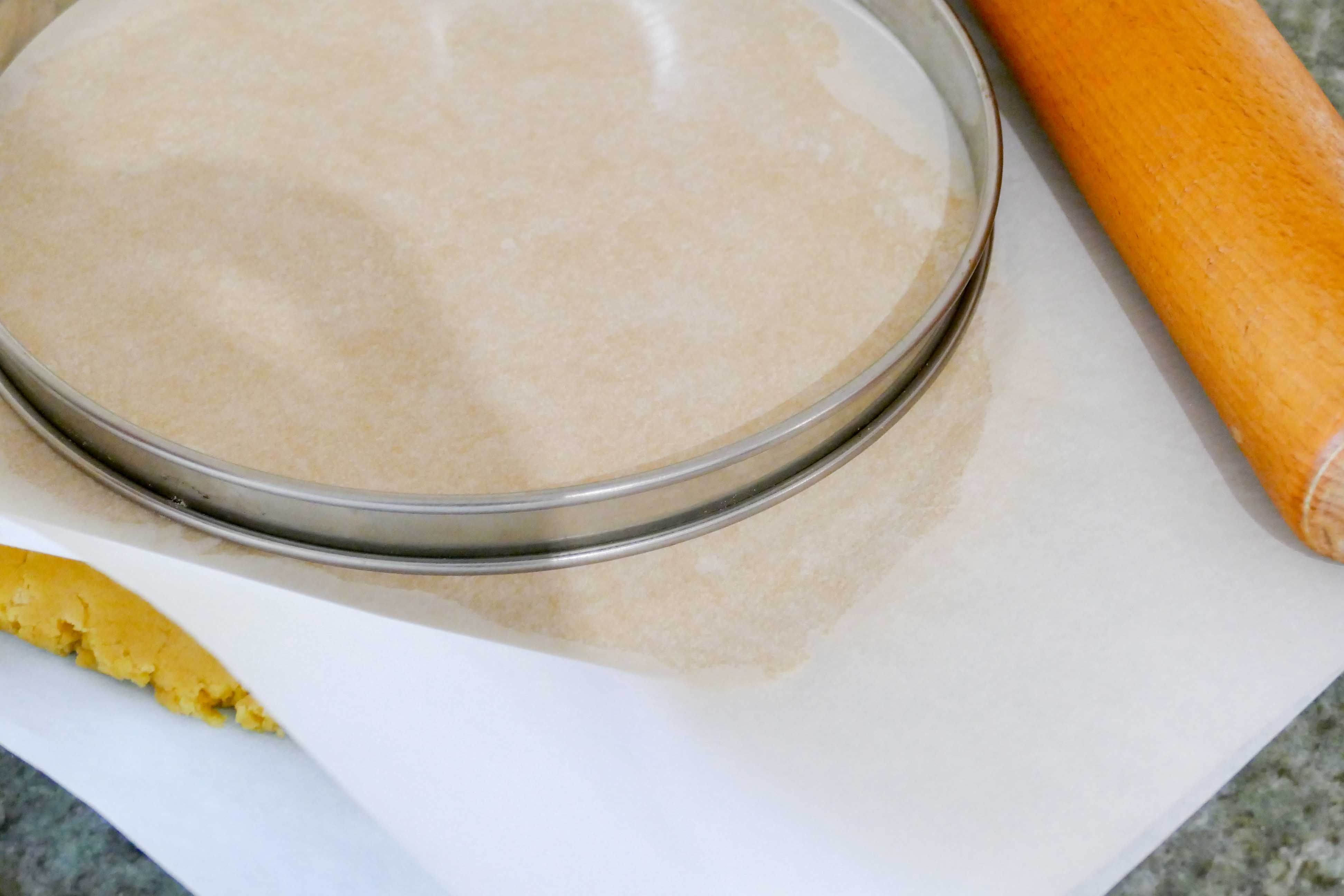 Débarrasser et rassembler en boule ; étaler entre 2 feuilles de papier cuisson. Découper le fond de tarte et prédécouper des bandes pour le pourtour; passer éventuellement au congélateur pour faciliter le fonçage. Piquer à la fourchette et cuire à blanc 20 à 25 minutes à 180 °C.
