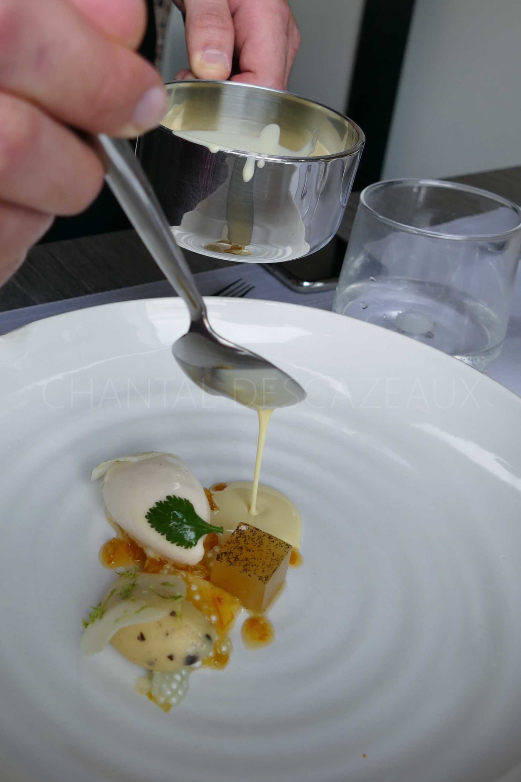 Les îles ont une influence certaine sur la cuisine de Gaël et Mickaël, c’est leur enfance, leur histoire ; on retrouve ici l’ananas en différentes textures, en gelée et mariné, accompagné d’un sorbet banane et crème passion, sauce chocolat blanc/passion. Ce n’est pas un dessert de Chef Pâtissier mais un dessert de cuisinier, pas de dressage sophistiqué mais amoureusement composé, les saveurs sont là, la feuille de coriandre anodine joue elle aussi son rôle, très bien.