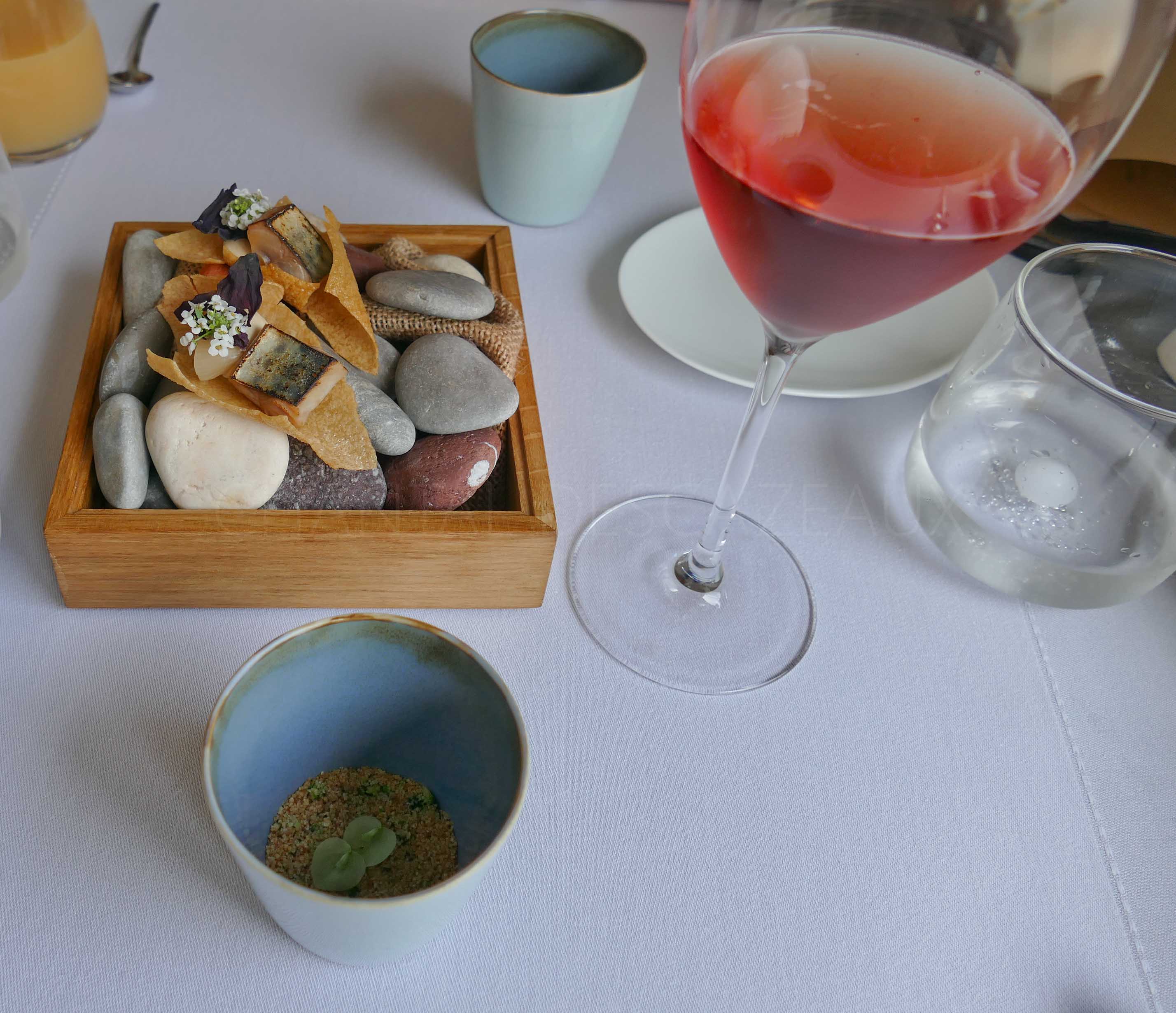 Mousse de pomme de terre ratte, sardine, quinoa soufflé et curcuma (verrine); églefin et condiment aigrelet; sablé coriandre ail noir et râpé de viande bovine des alpes de Haute Provence