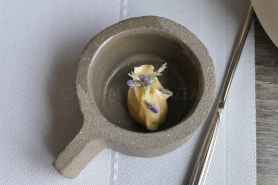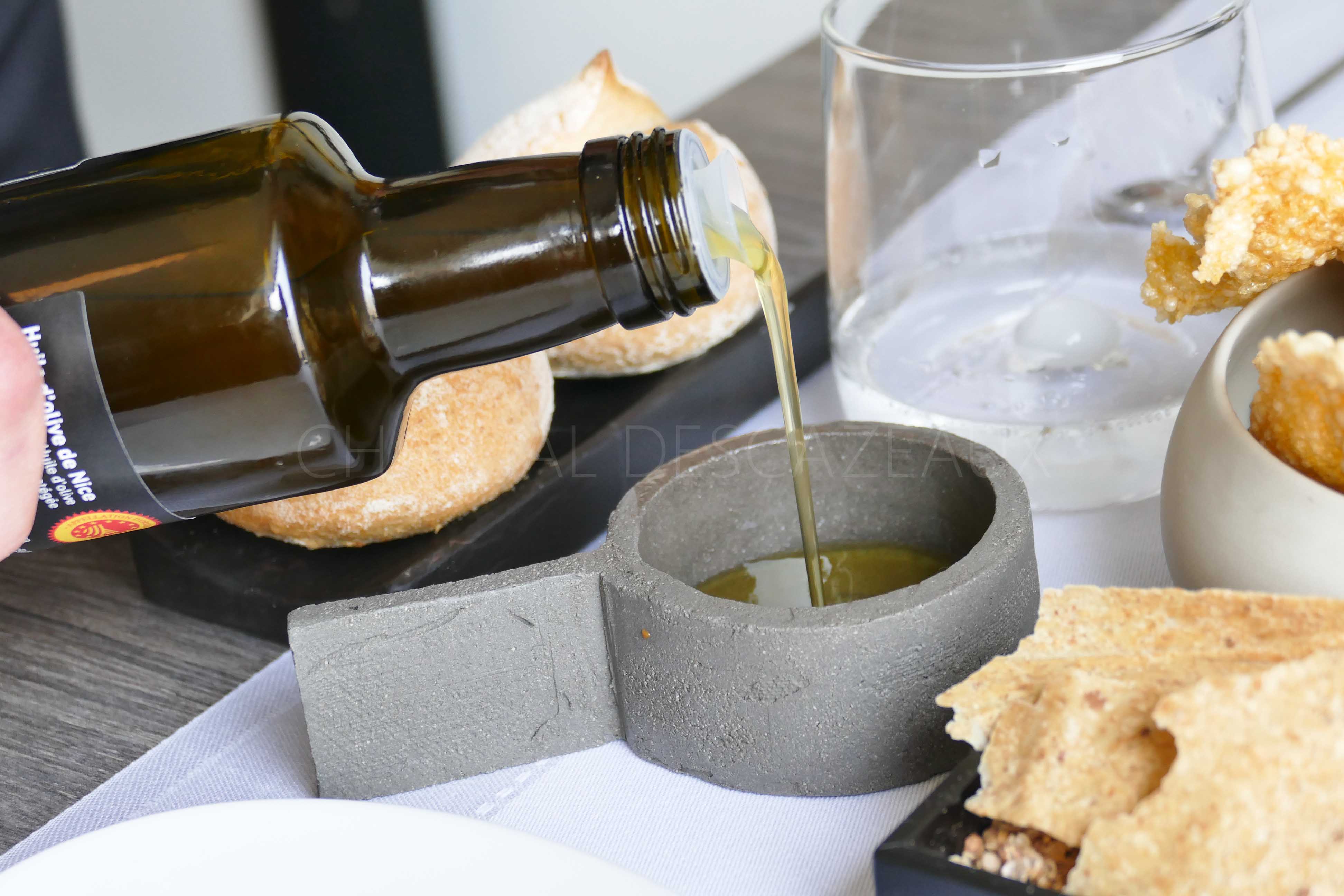 Croustillants à la coriandre, chips de polenta et petits pains gingembre/coriandre faits maison, huile d’olive de Nice, et beurre Bordier poudré d’olives noires qui vont nous accompagner tout au long du repas: