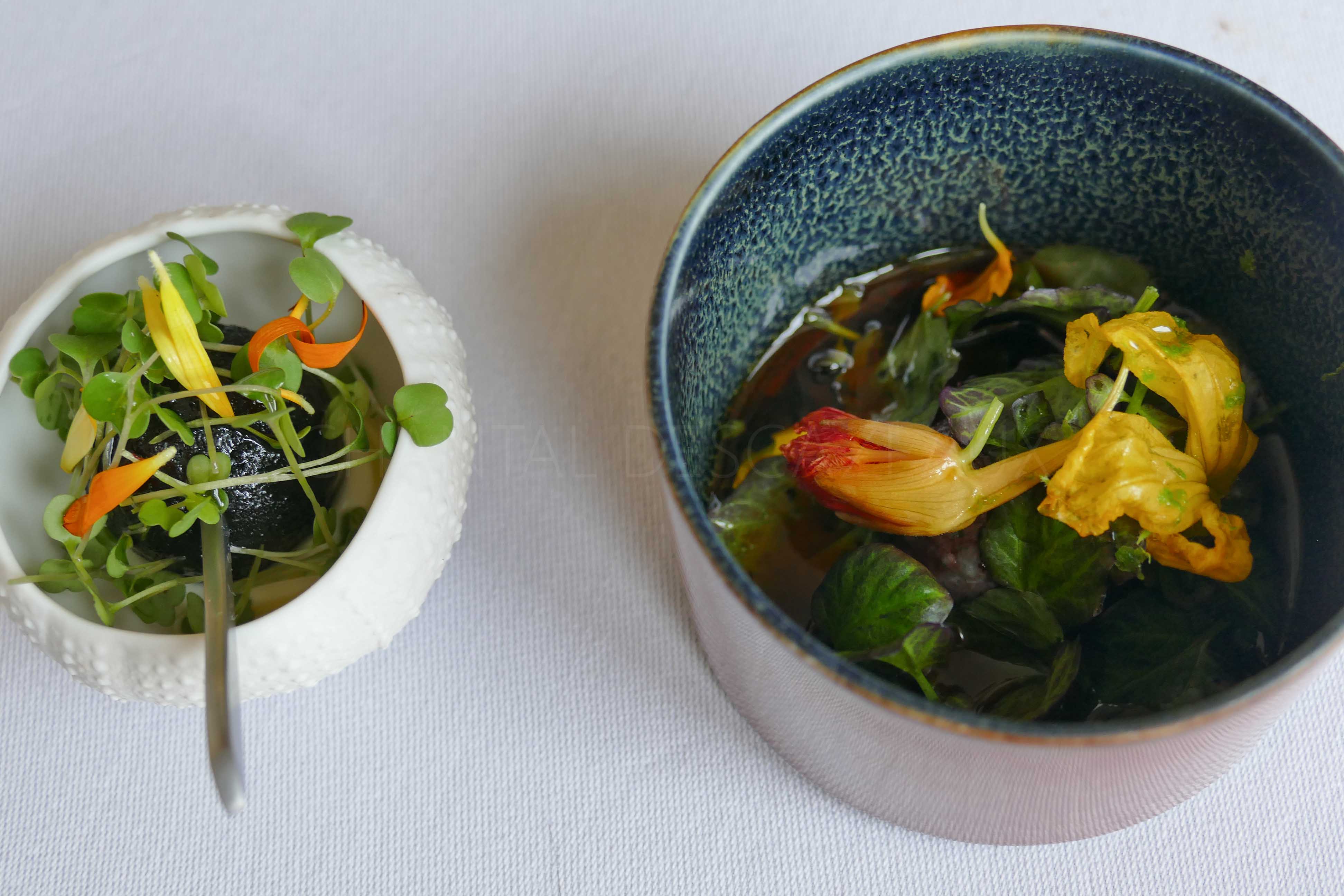 Boudin noir fait maison au lard de Colonnata et fleurs d’agrumes, accra de morue à l’encre de seiche, chèvre frais provençal, jeunes pousses d’oseille