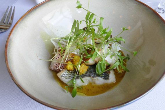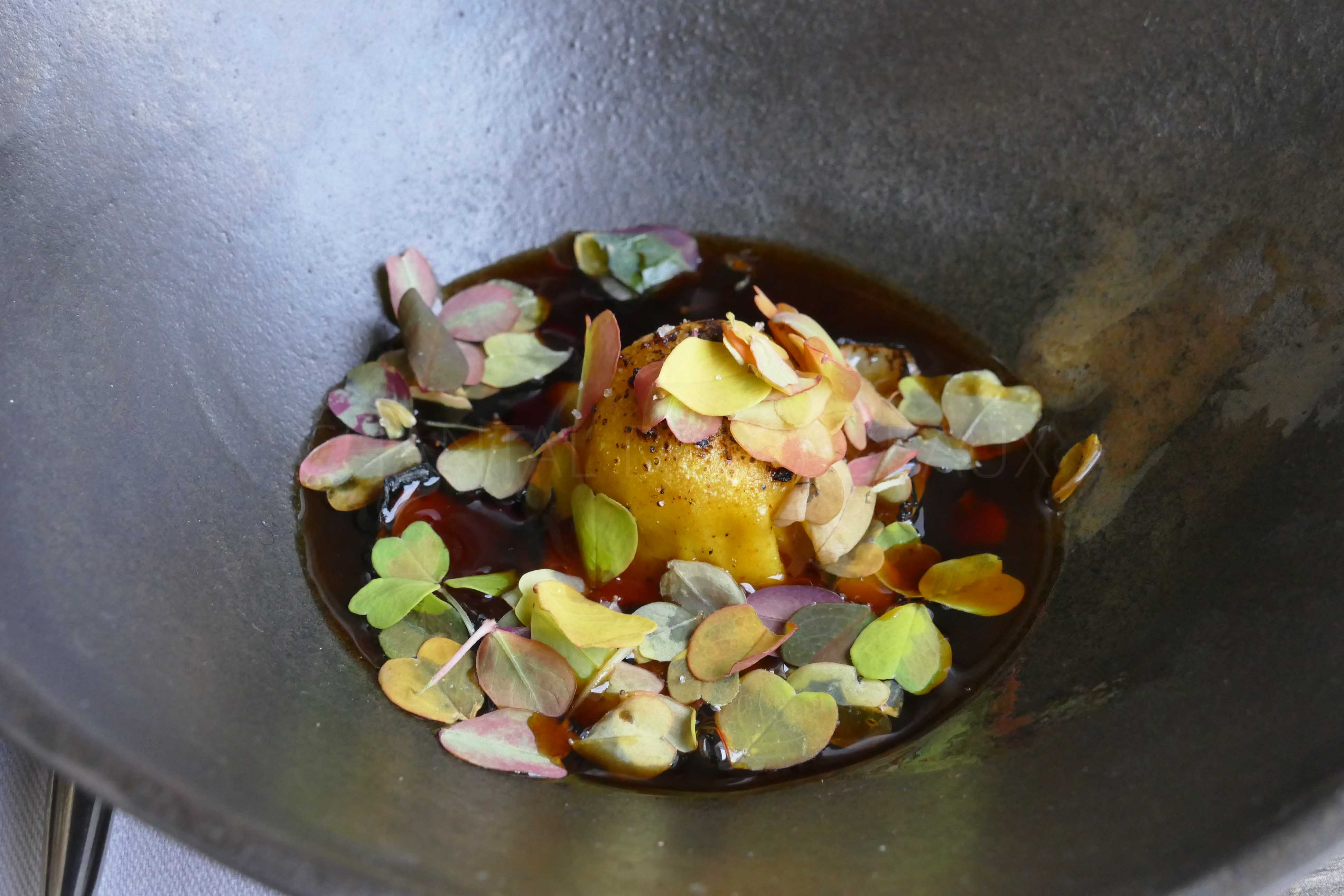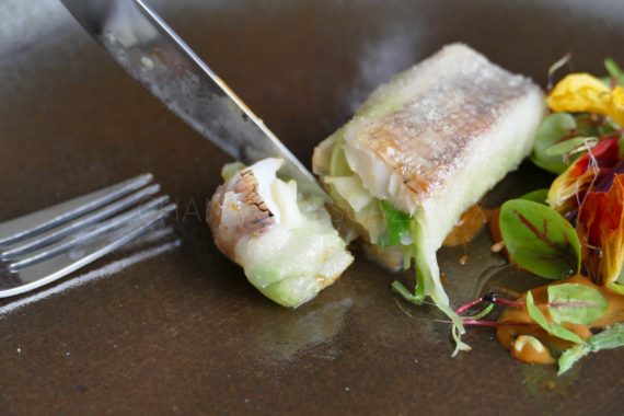Rouget du Port de Carras délicatement enveloppé dans une feuille de riz, soupe de poisson et feuilles et fleurs sauvages… Des bases méditerranéennes ponctuées de saveurs et de techniques venues d’ailleurs, on voyage au pays des émotions, on découvre cébette et fenouil à l’intérieur de la feuille de riz, la cuisson est une pure merveille, topissime.