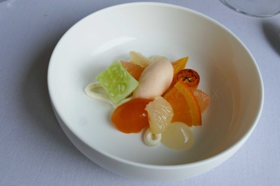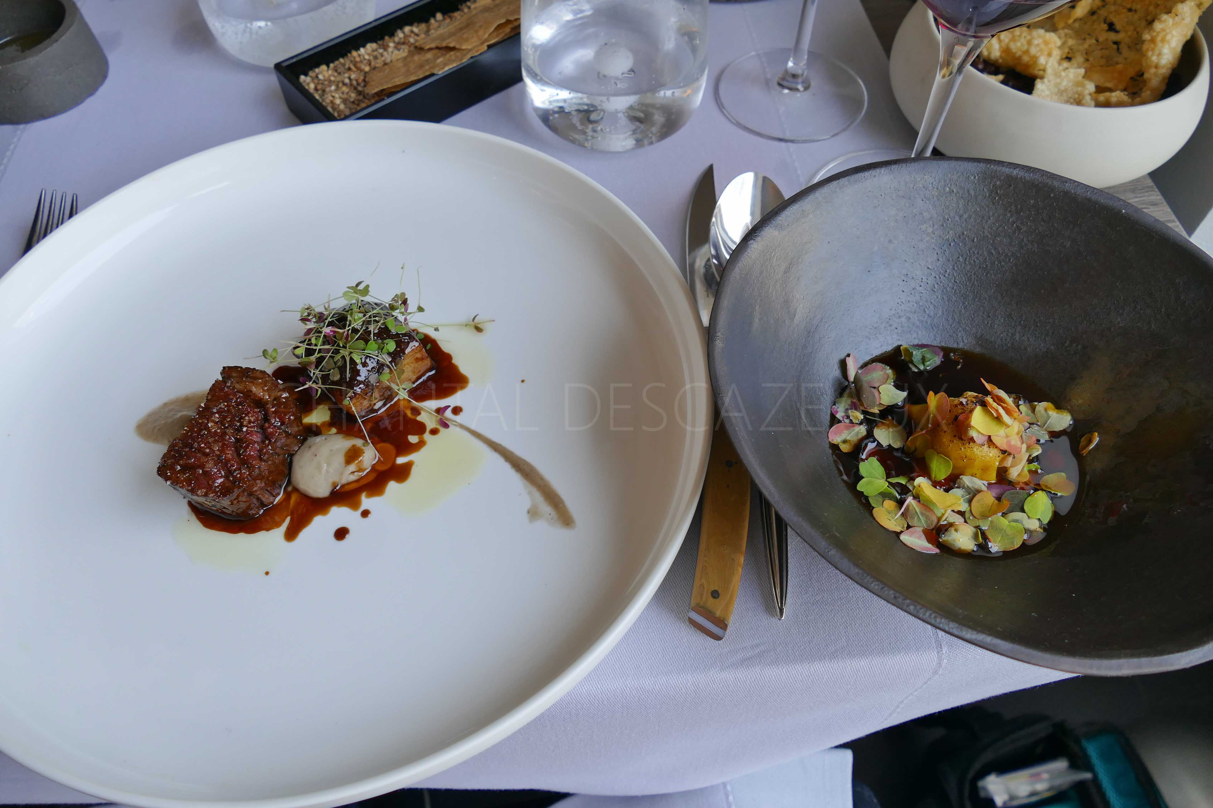 La pêche du jour est comme son nom l’indique en fonction de la pêche du jour ^^ ; aujourd’hui c’est lotte, tanude et calamar des profondeurs. Pour accompagner, fenouil confit, jeunes pousses de livèche, huile de livèche faite par les Chefs, jus aux accents d’épices indiennes. Tout est d’une extrême justesse, gourmand… ici on est bercé par une mélodie de saveurs, on mixe les côtes françaises du sud et l’Asie, une merveille d’équilibre!