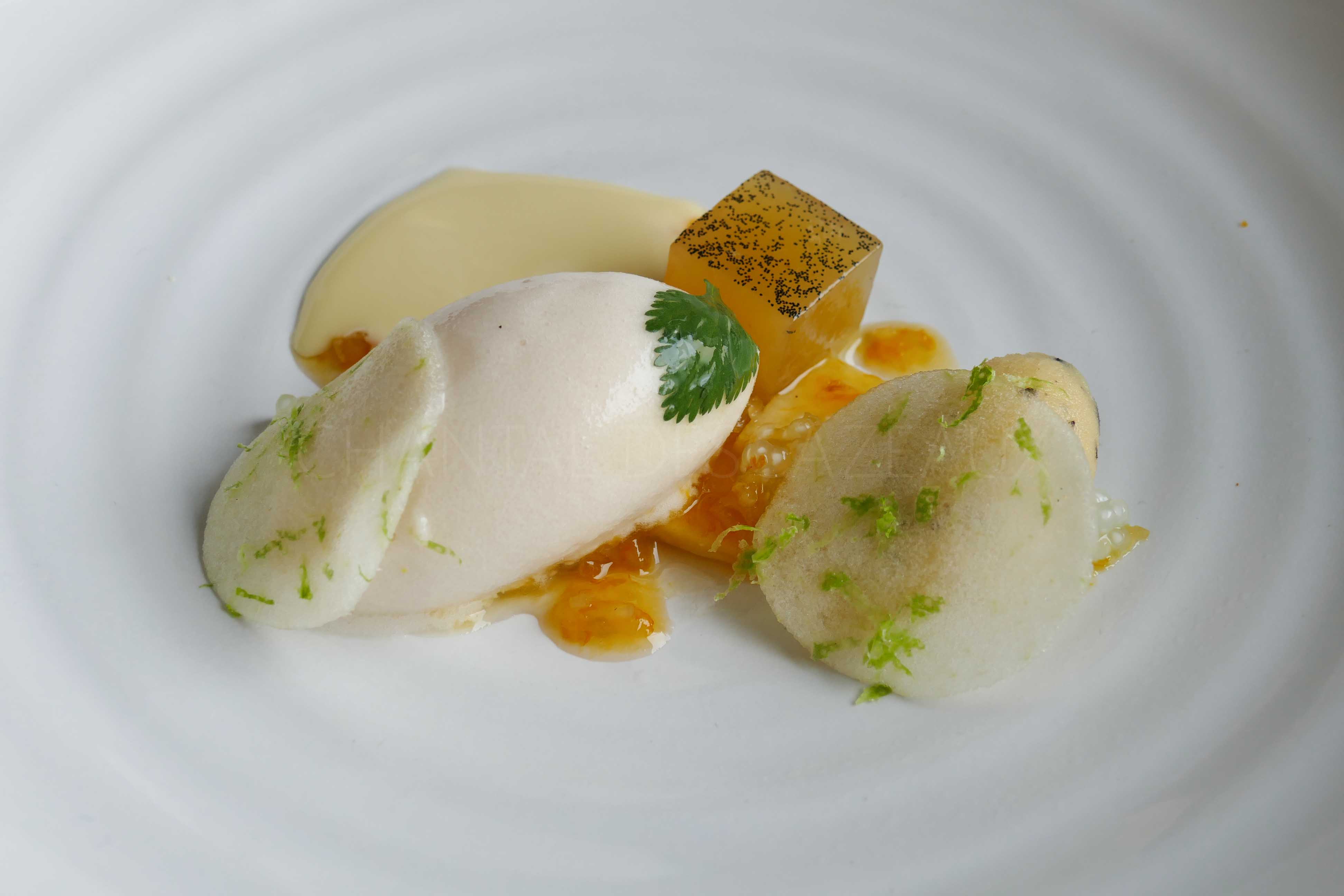 Pâte de fruit mangue papaye noix de coco, eau de coco et citron vert; amandes caramélisées curcuma et safran; air de cacao; citron de Menton et pépite chocolat au thé Matcha; lait pris au gingembre, herbes et fleurs aromatiques; caramel beurre salé
