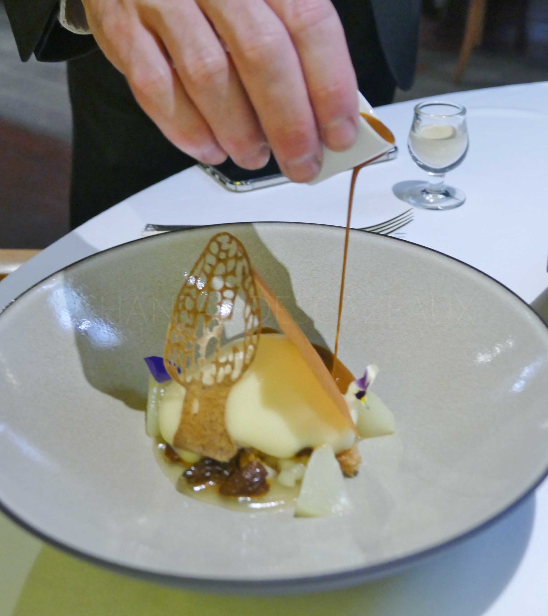 Dessert phare de la Maison Marcon, cette association est fabuleuse. Une composition avec de la poire fraîche, une émulsion légère et mousseuse, un caramel de morille à tomber, une gavotte croustillante… Top top top!