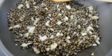 Cuire les lentilles comme un risotto. Faire chauffer un peu d’huile d’olive dans une poêle; faire suer l’oignon émincé sans coloration. Verser les lentilles, faire rissoler une minute puis verser le bouillon petit à petit comme pour un risotto. Les lentilles vont cuire par absorption. Prévoir environ 30 minutes de cuisson, elles doivent rester fermes.