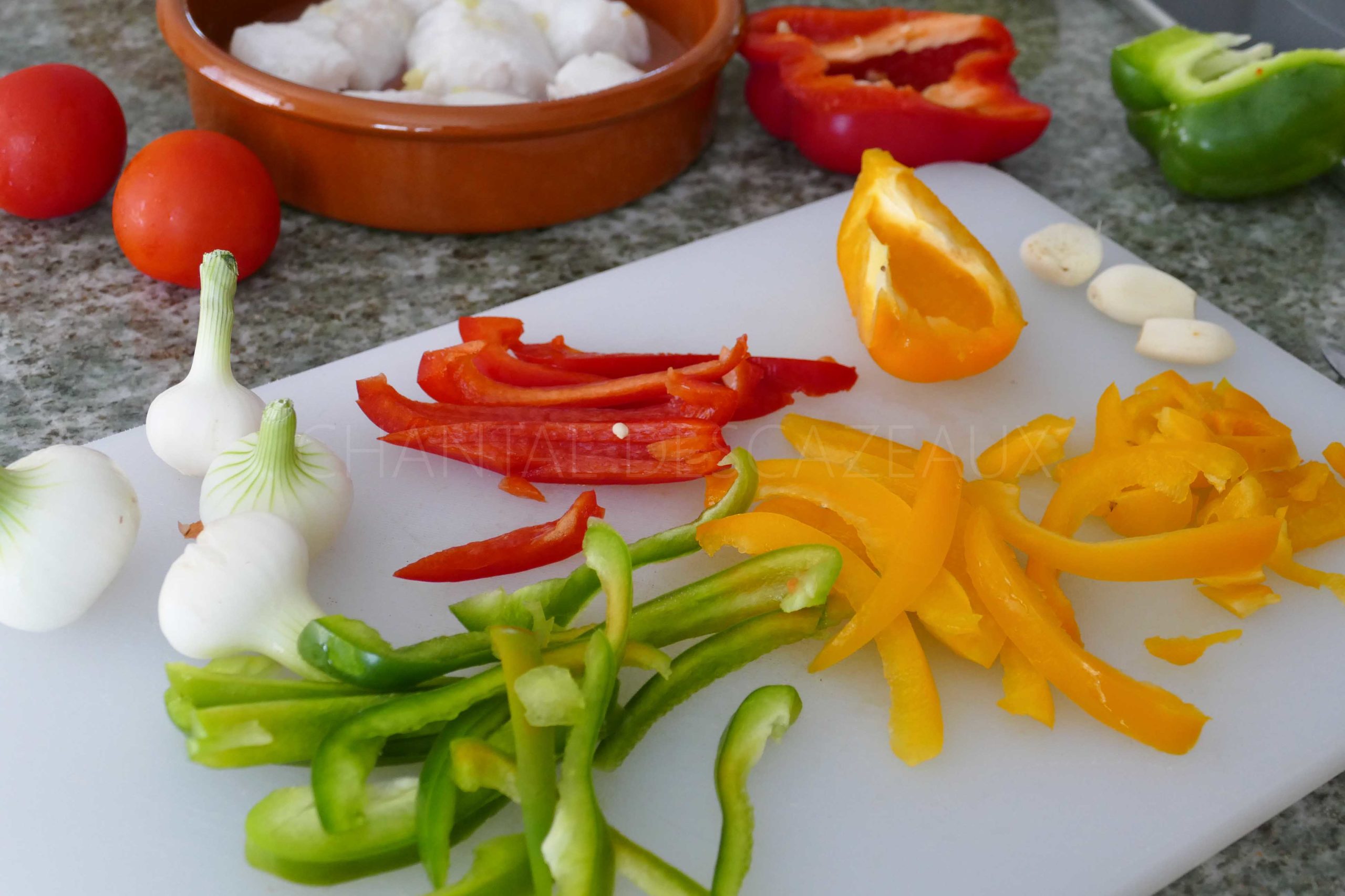 - 4 tomates, 1/2 poivron vert, 1 poivron jaune, 1/2 poivron rouge
