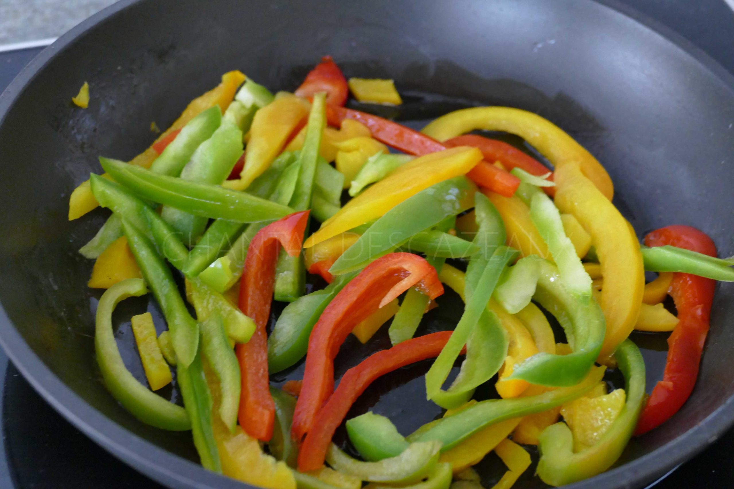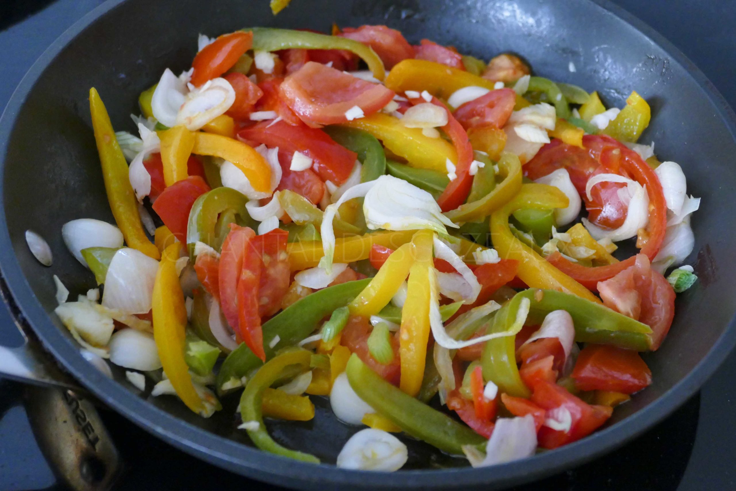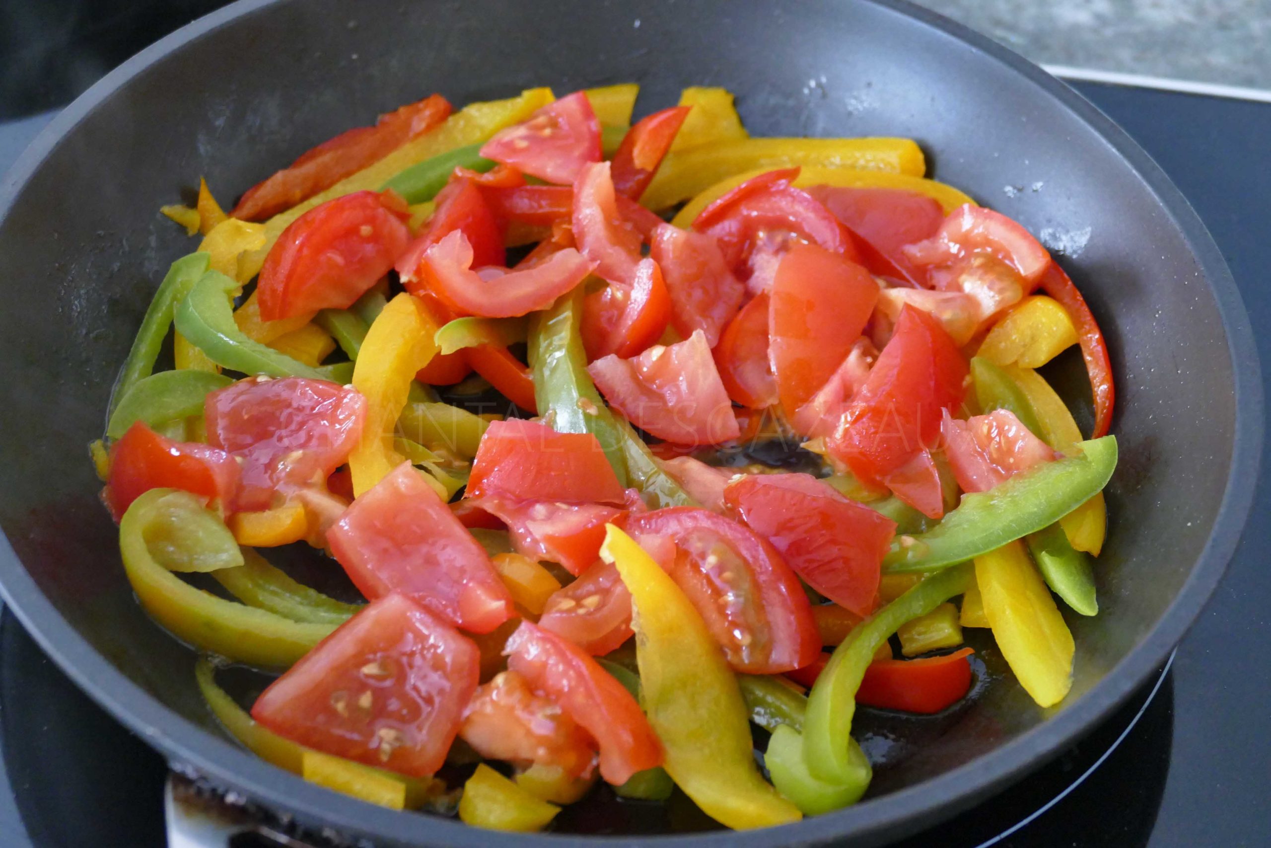 Pendant ce temps, couper les poivrons en lanières, émincer les oignons et peler les gousses d’ail. Faire suer les poivrons dans une poêle avec un filet d’huile d’olive pendant 5 bonnes minutes. Ajouter les oignons, les tomates coupées en morceaux, l’ail, assaisonner et laisser cuire 10/15 minutes à feu doux.