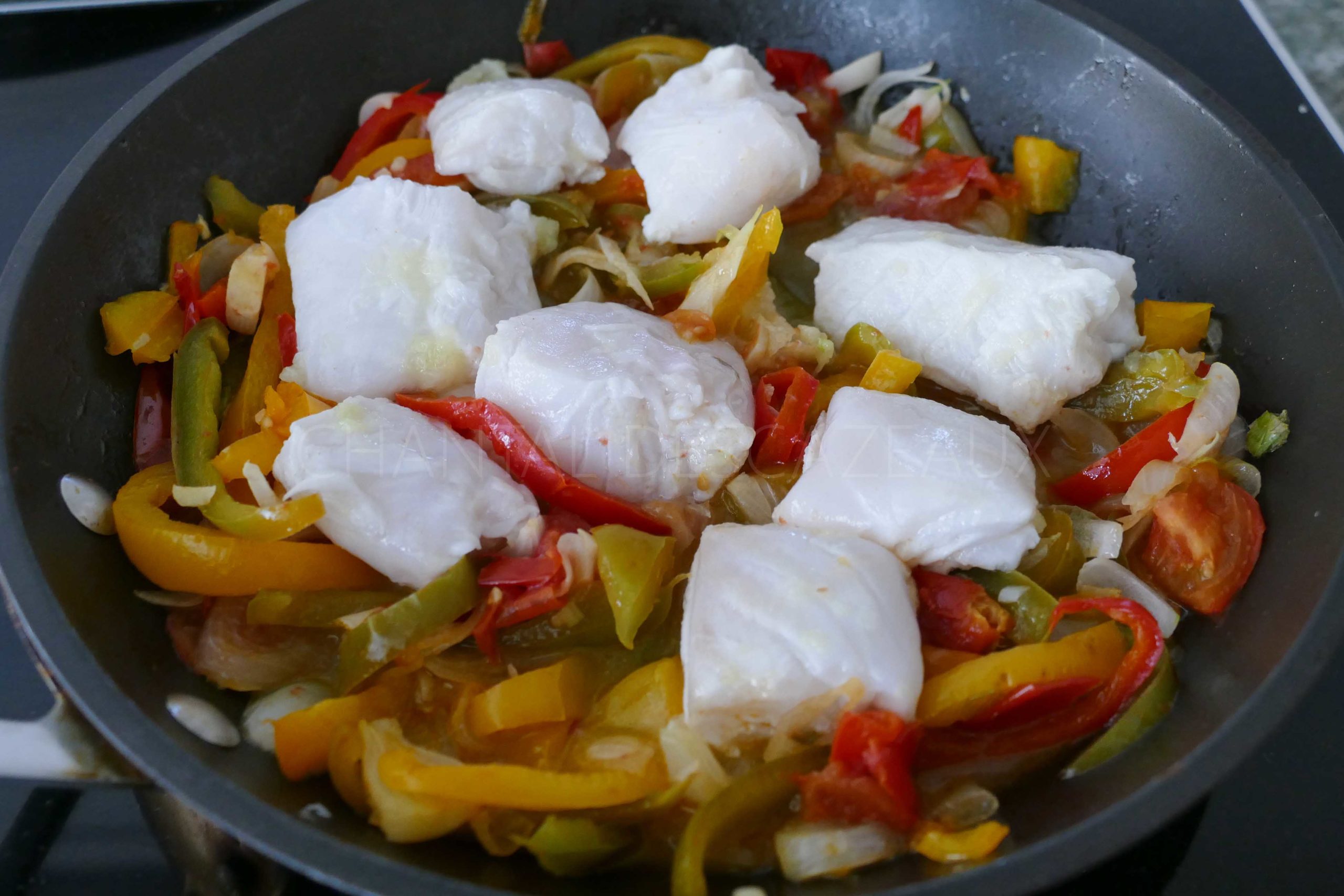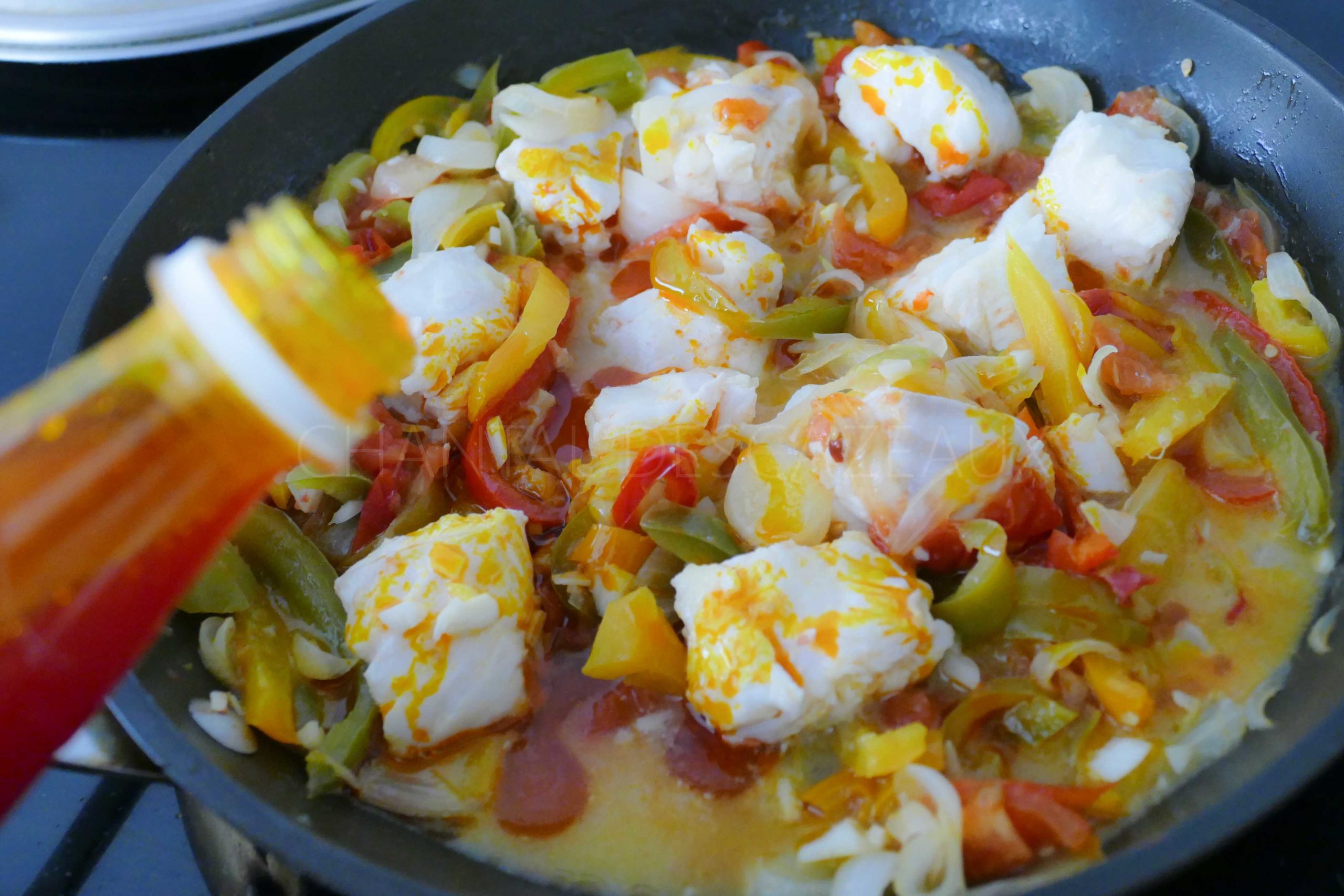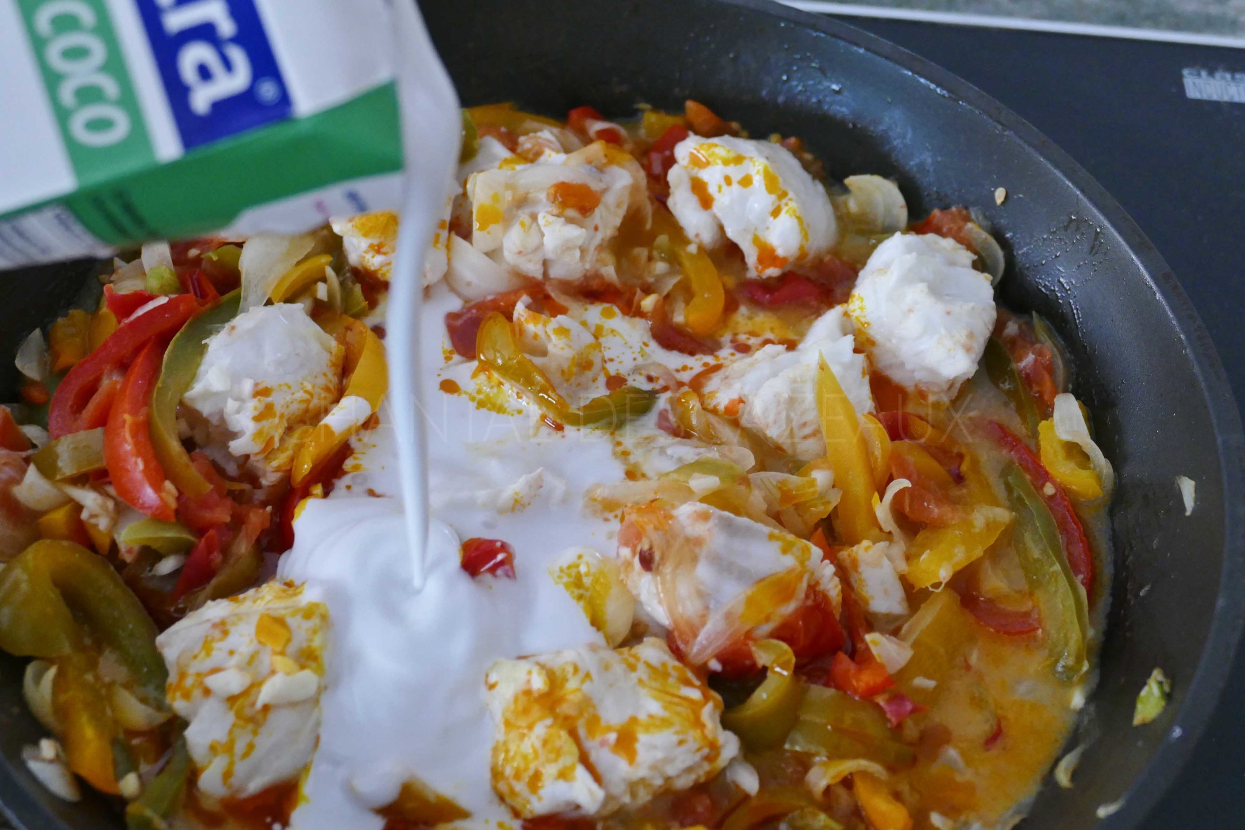 Poser alors les morceaux de poisson sur les légumes, verser la marinade, ajouter le piment selon votre goût, puis verser le lait de coco et la cuillérée d’huile rouge de dendê. Mélanger et laisser cuire 7/8 minutes.