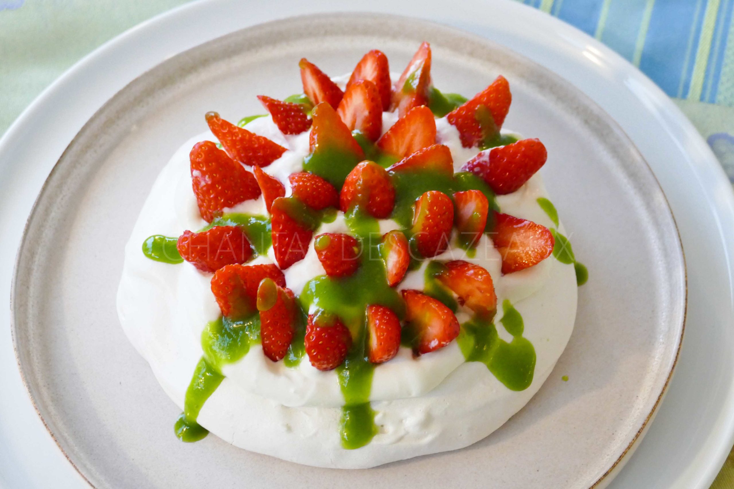 Pavlova fraises, chantilly orgeat et sirop de petits pois