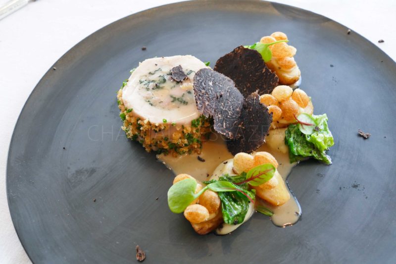 Cuisson impeccable du poisson, un plat très gourmand avec des éclats de noisettes torréfiés, une sauce condimentée (câpres…) et truffée de folie servie sur l’endive délicatement braisée, un voile de Comté ajoute de la douceur et de la gourmandise, le sabayon au vin jaune s’exprime pleinement, un plat fabuleux.